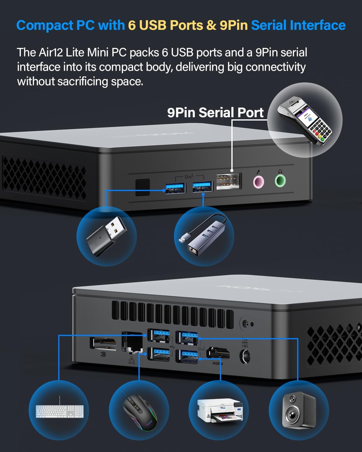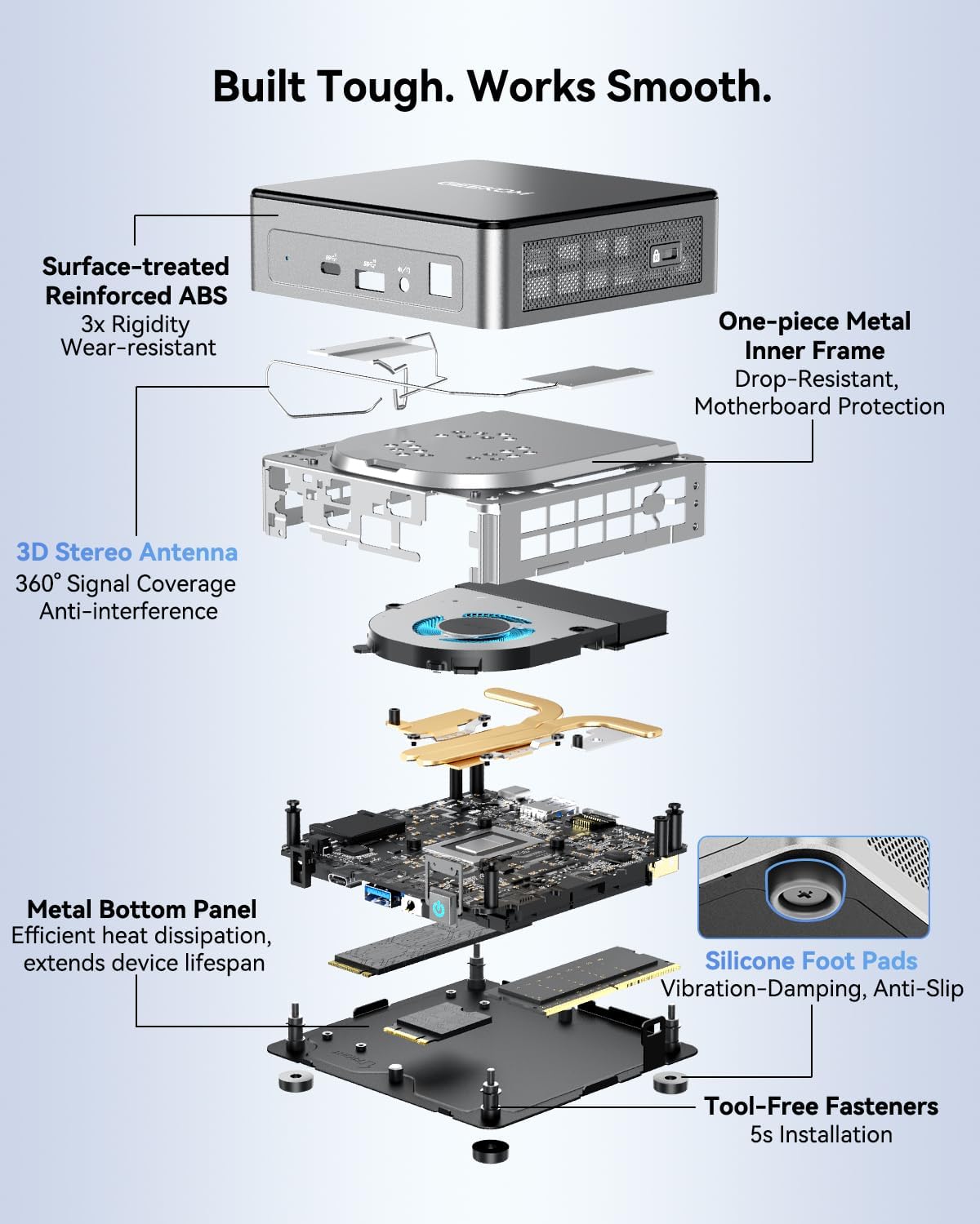 • 【Every Detail Built to Last 】The Air12 mini computer is engineered with a three-times-reinforced ABS+PC shell, a strategically placed metal mid-frame, and a reinforced baseplate for optimal strength-to-cooling balance. Tool-free upgrades, vibration-damping feet, and a 3D antenna deliver uncompromised durability—all the toughness you need, without the extra bulk.
