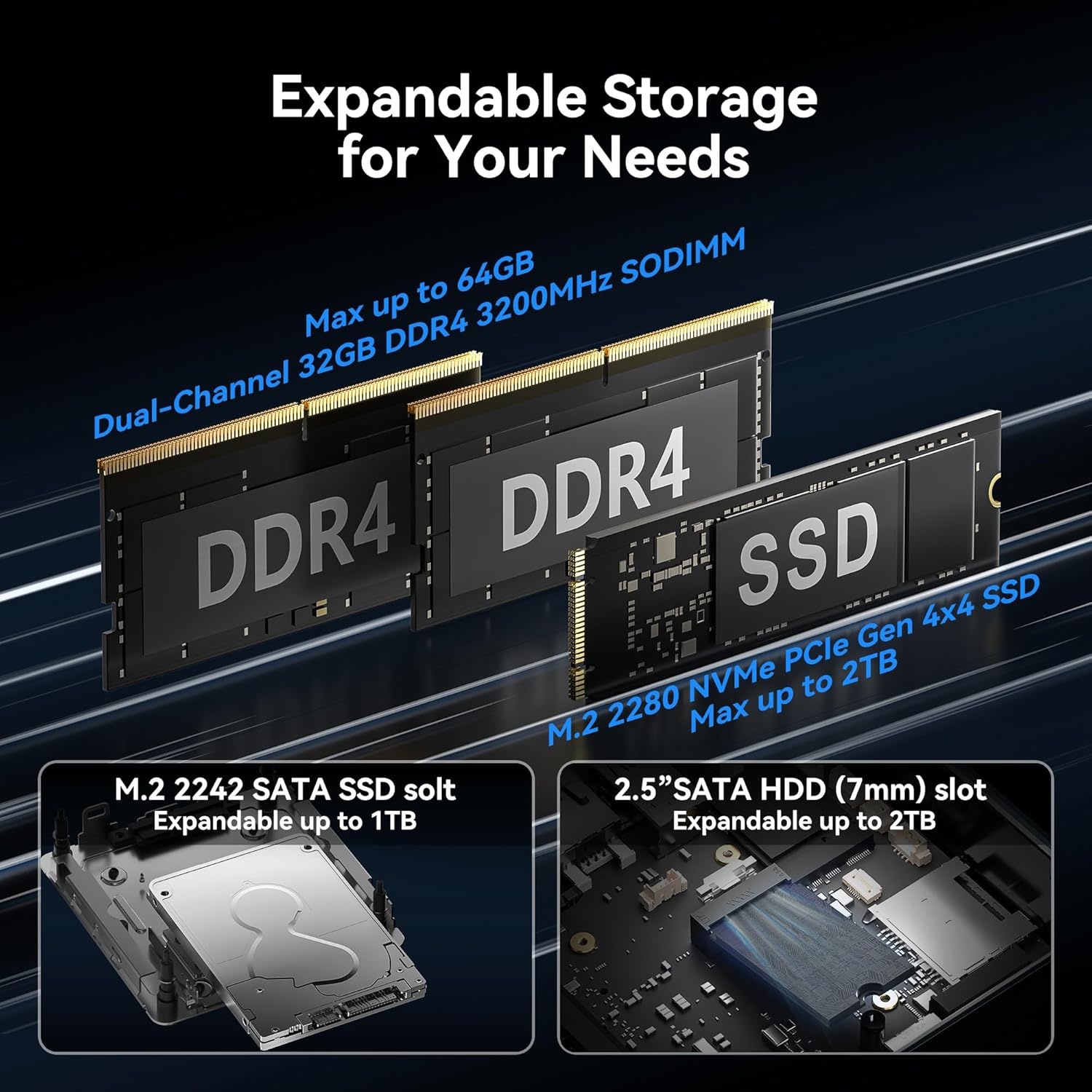 - 【High-Speed 32GB RAM & 1TB SSD】Equipped with 32GB DDR4-3200MHz RAM (expandable to 64GB) and a 1TB PCIe 4.0 NVMe SSD (70% faster than PCIe 3.0), plus additional storage options including M.2 slots for SATA SSDs up to 1TB and PCIe 4.0 SSDs up to 2TB.