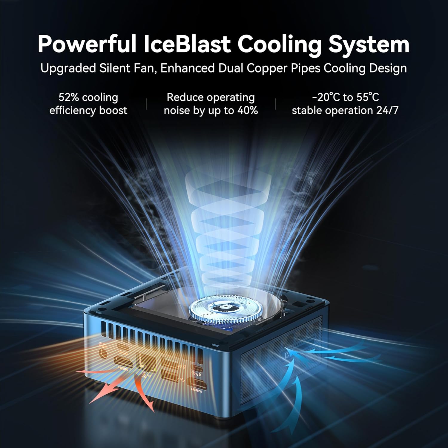 - 【IceBlast Improved Cooling System 】This mini PC features GEEKOM's proprietary IceBlast cooling technology, incorporating additional thermal conductors, enhanced thermal interface materials, and optimized fans to effectively manage internal temperatures. Specially engineered fan blades reduce noise levels by 40% compared to conventional designs, enabling distraction-free work environments.