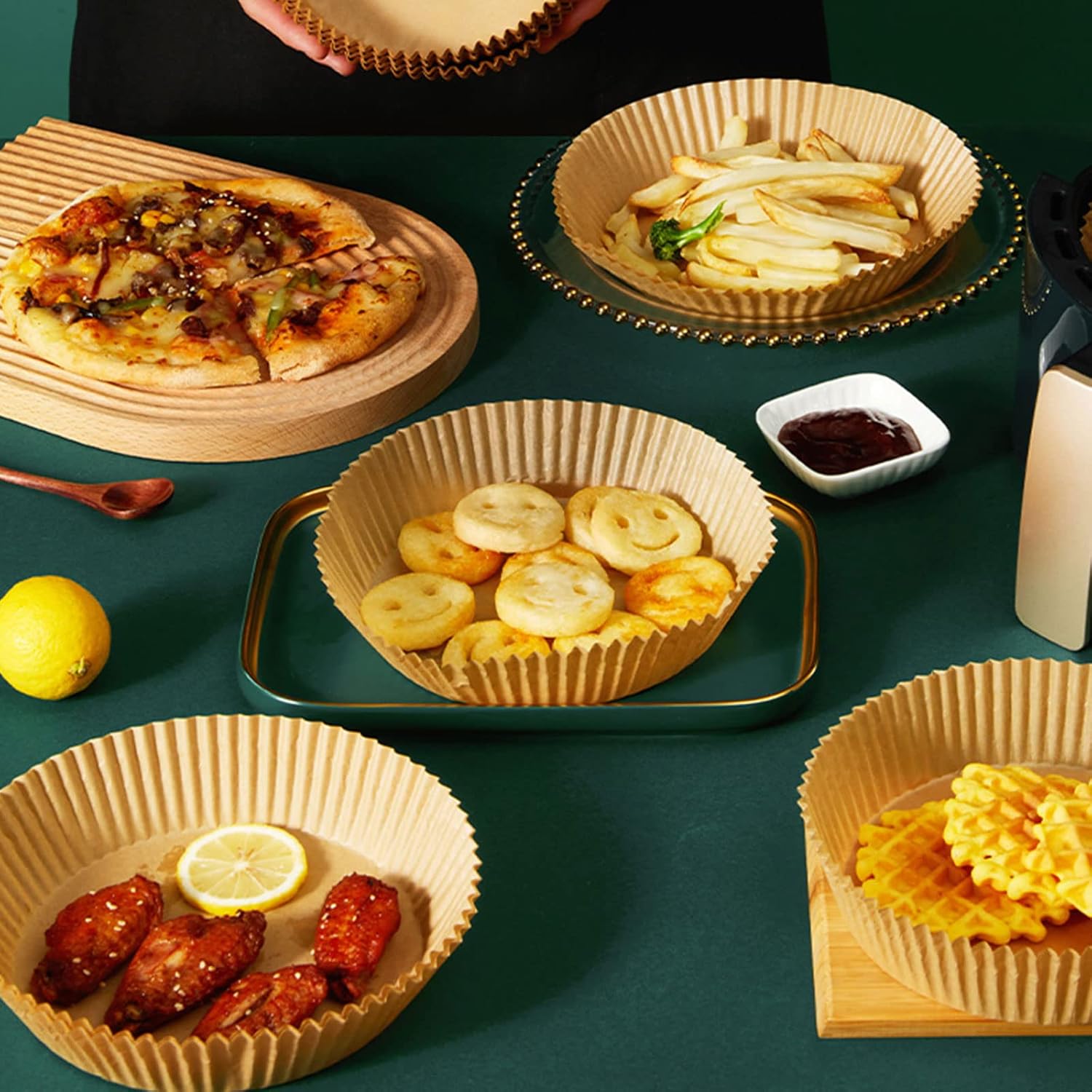 Warm Tip: Do not put empty air fryer paper when preheating, and do not use too little food to avoid disposable paper liners that cannot be pressed because of their light weight, and hot air blowing the paper liners into the heat pipe causing the paper pan to burn
