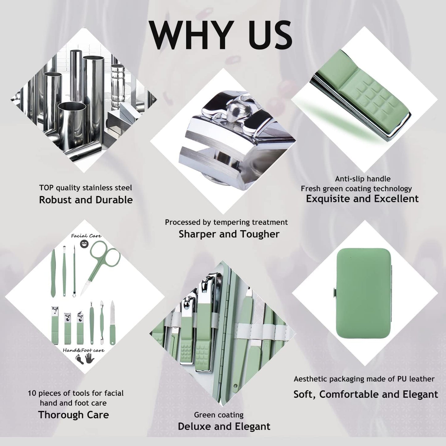 UNIQUE JADE GREEN STYLE and PREMIUM QUALITY Made A REAL Difference: Crafted from top-quality stainless steel, HANTEKAS Professional manicure set is sturdy and durable,offering flawless performance and a lifetime use. What is more, the stylish and unique JADE GREEN combinations, which is first time to show on the market, gives it a glamorous look and make you outstanding from the crowd.
