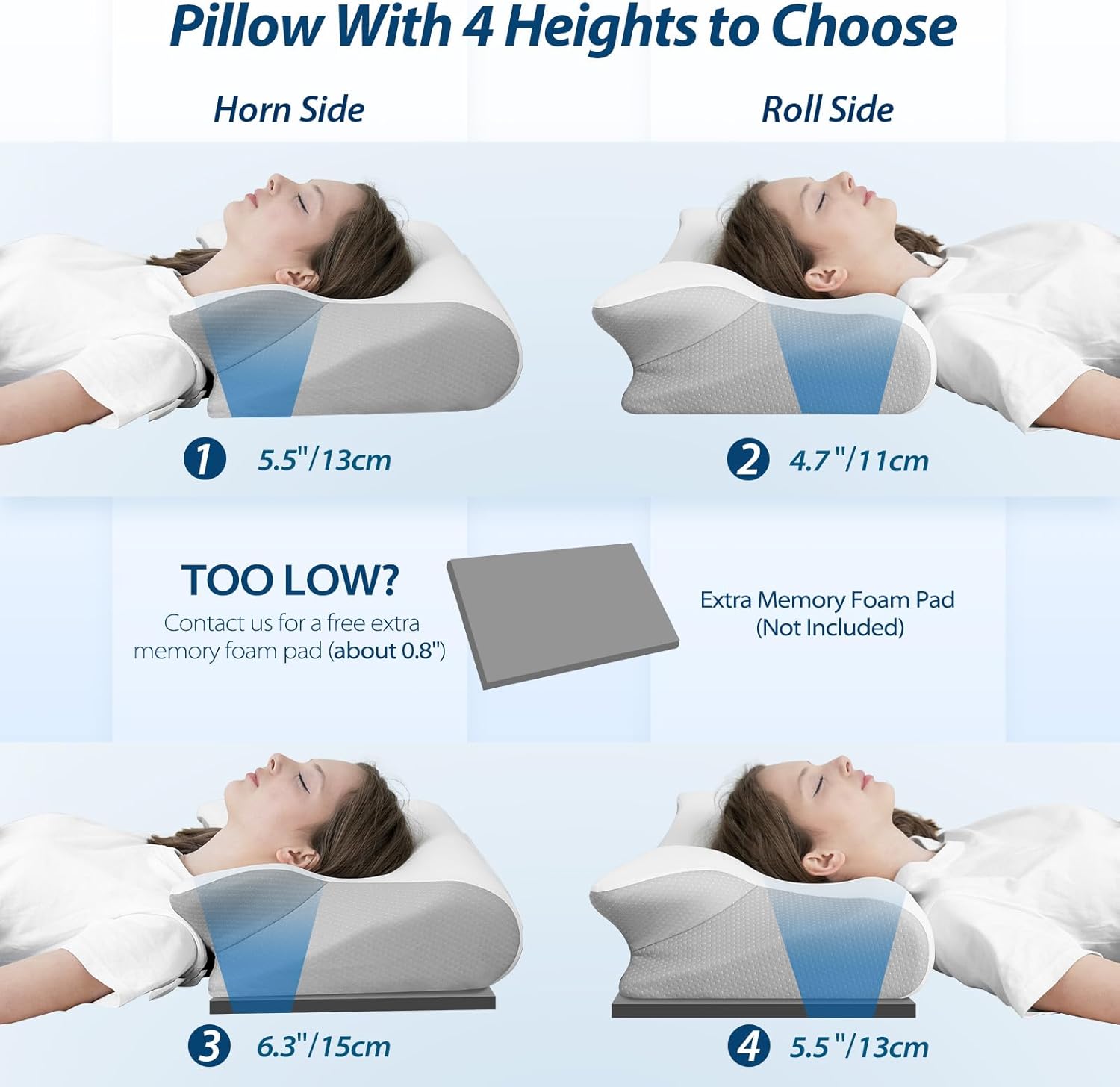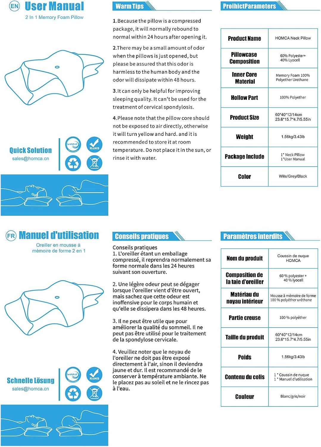 2 in 1 Neck Pillow: HOMCA memory foam pillow combines a neck roll pillow and a ordinary pillow, you can sleep on both sides. The neck pillow features an ergonomic design to help support your head, neck, shoulder and back, allowing you to drift off into uninterrupted slumber and wake up feeling fresh