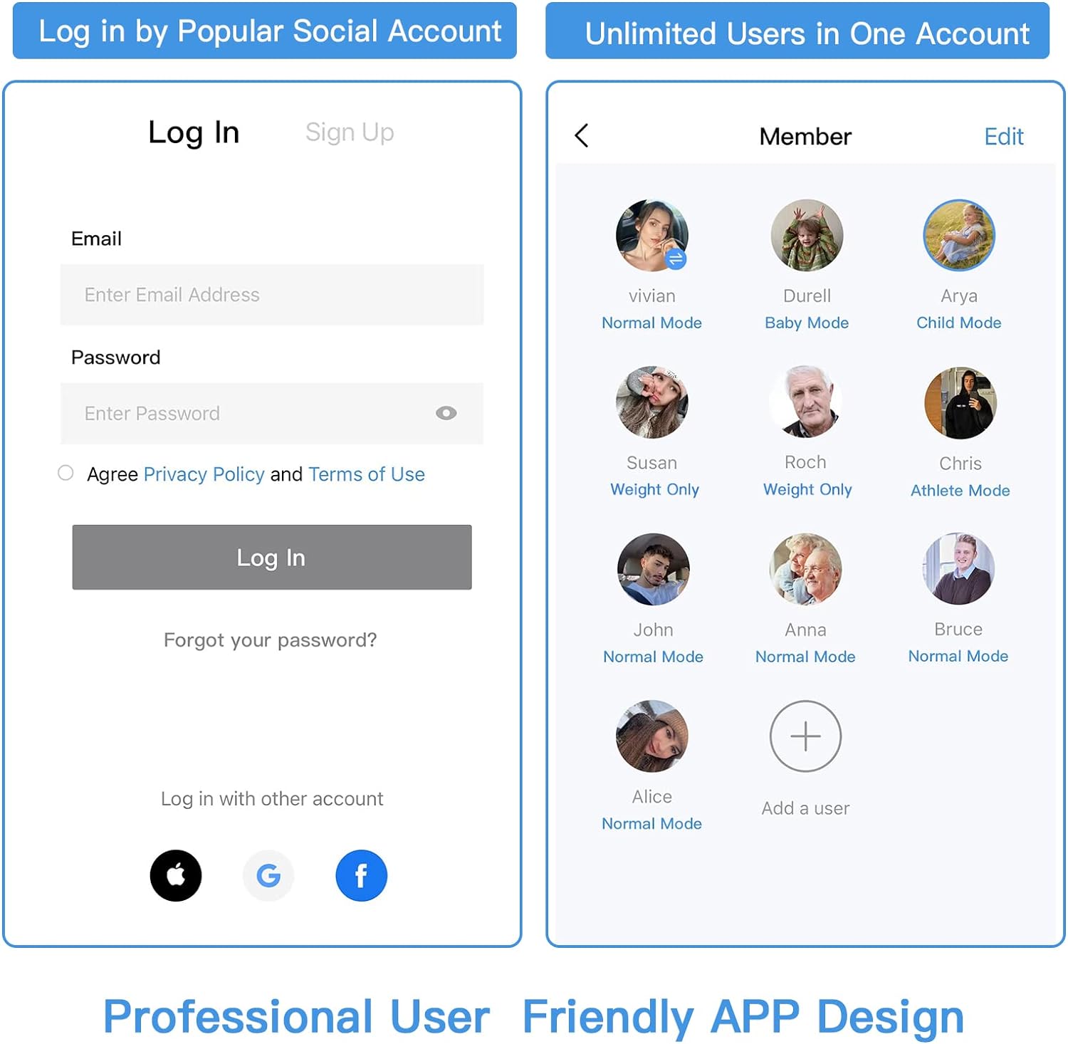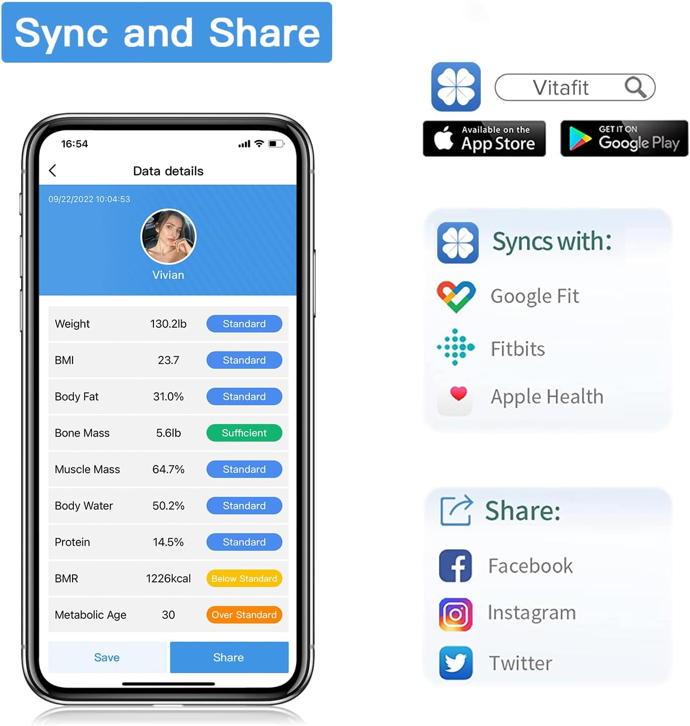 SYNC AND SHARE – The smart scale App is designed for friendly-user. Sync your data with popular fitness apps Apple Health, Google Fit to conveniently view your fitness graphs. Furthermore, easily share your progress on major social media platform.