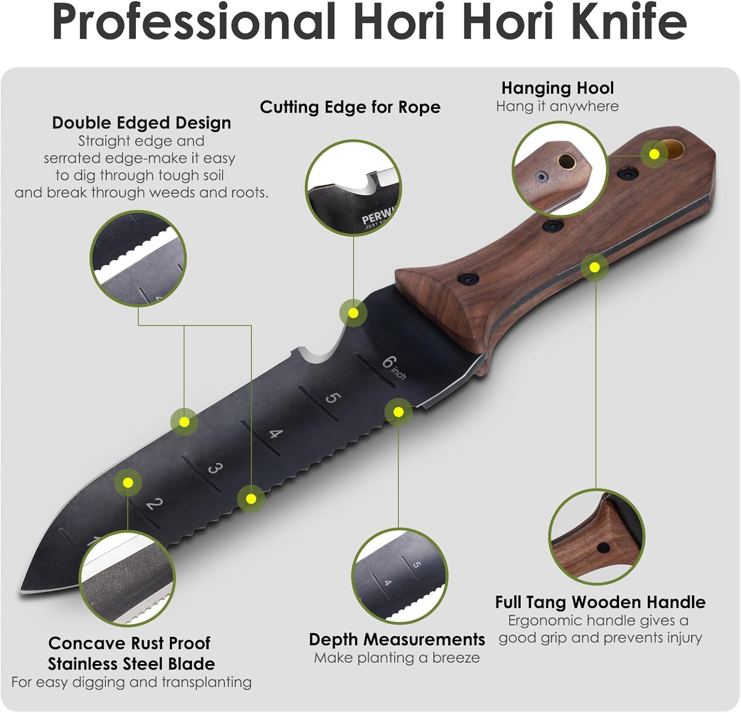 Wonderfully Versatile: Hori Hori garden knife for every job in the garden, use it for digging, transplanting, sawing, cutting, removing, dividing, and even measuring soil depth for planting.