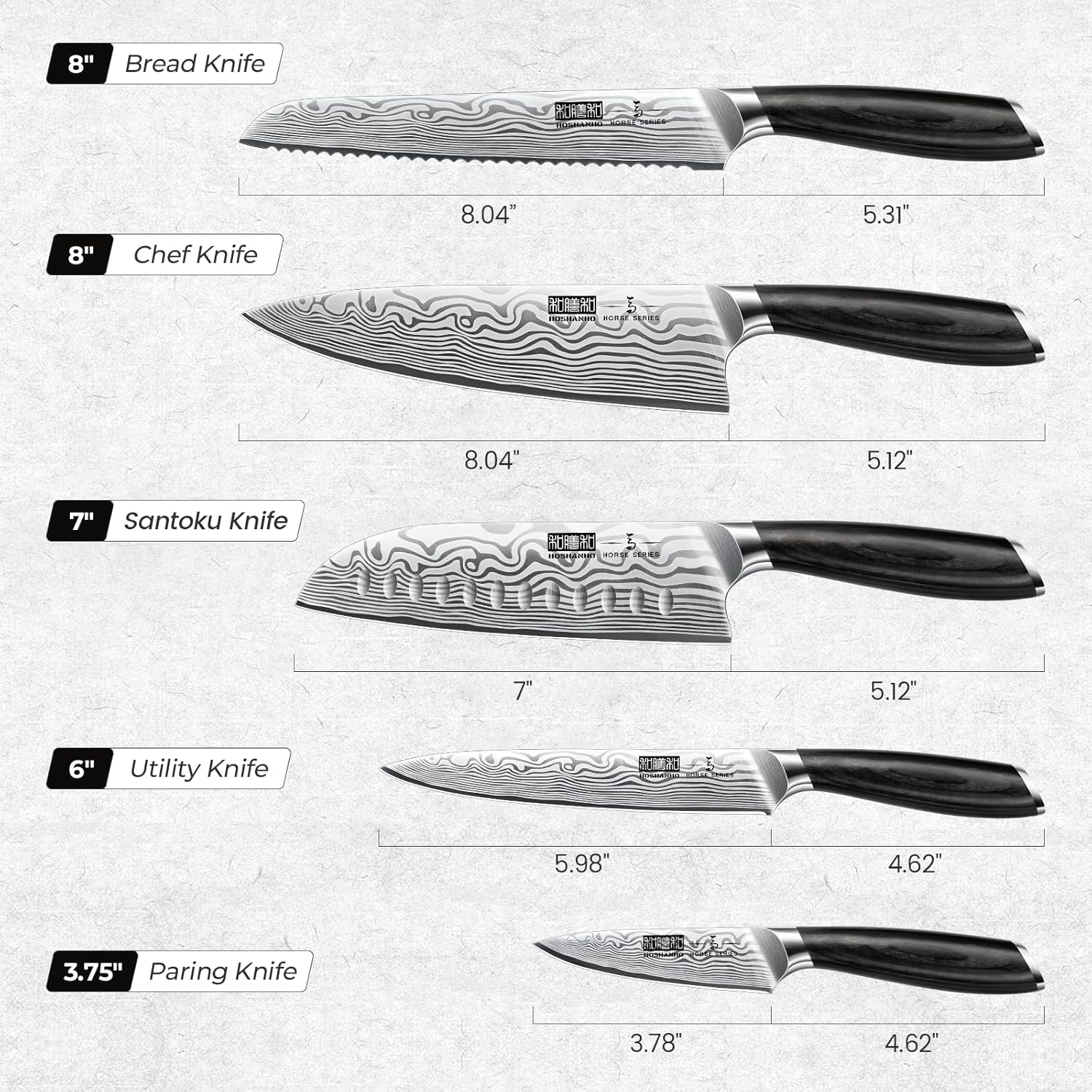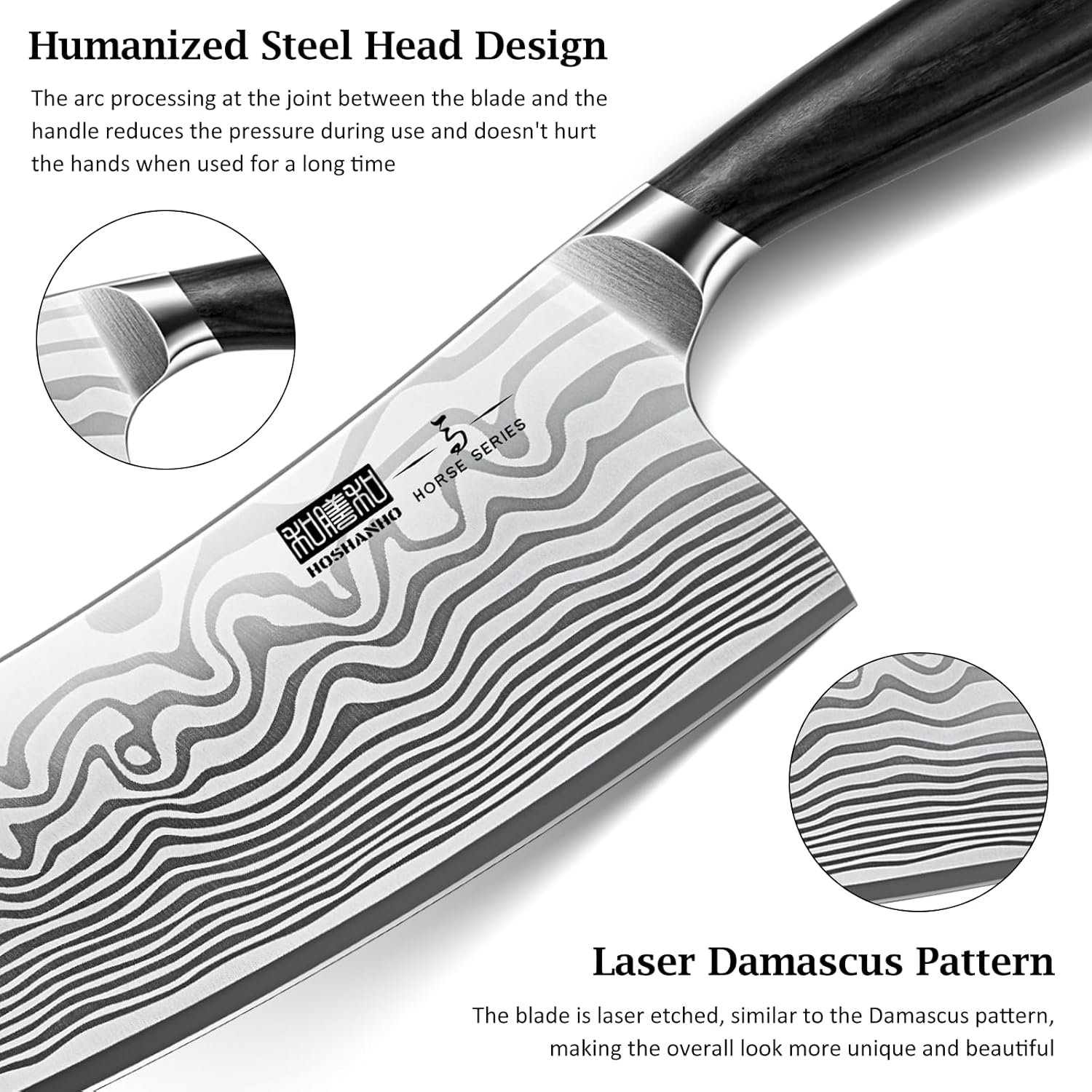 【Premium Quality Steel】Made with japanese high carbon powder steel with a hardness of 62 HRC, known for its durability, corrosion resistance, and ability to retain a sharp edge; And the special waved pattern blade is laser engraved, different from damascus pattern
