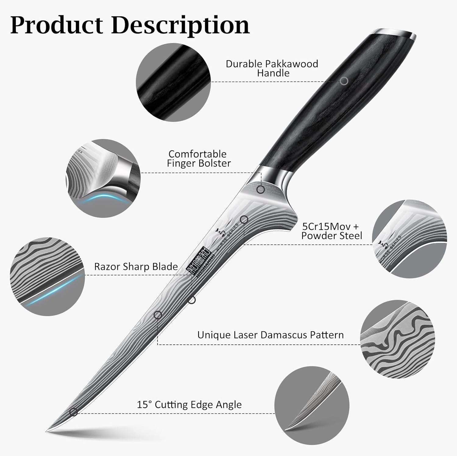 【Versatile Deboning Knife】Excelling in filleting tasks, this boning knife also adapts to a wide range of cutting needs, making it a staple in any kitchen; Whether you're a professional chef or a culinary aficionado, this fillet knife will elevate your kitchen skills