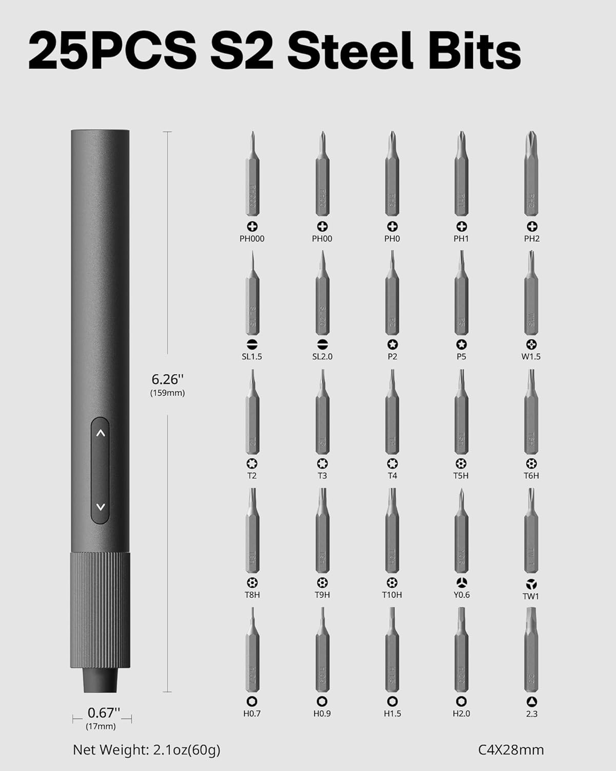 Included Components 1 x Electric Precision Screwdriver, 1 x Magnetic Storage Box, 1 x USB-C Charging Cable, 25 x S2 Steel Bits (C4 x 28 mm): Torx: T2, T3, T4, T5H, T6H, T8H, T9H, T10H, Phillips: PH000, PH00, PH0, PH1, PH2, Hex: H0.7, H0.9, H1.5, H2.0, Flat Blade: SL1.5, SL2.0, Pentalobe: P2, P5, Pozidriv: W1.5, Y-shaped: Y0.6, Tri-wing: TW1, Triangle: Δ2.3.