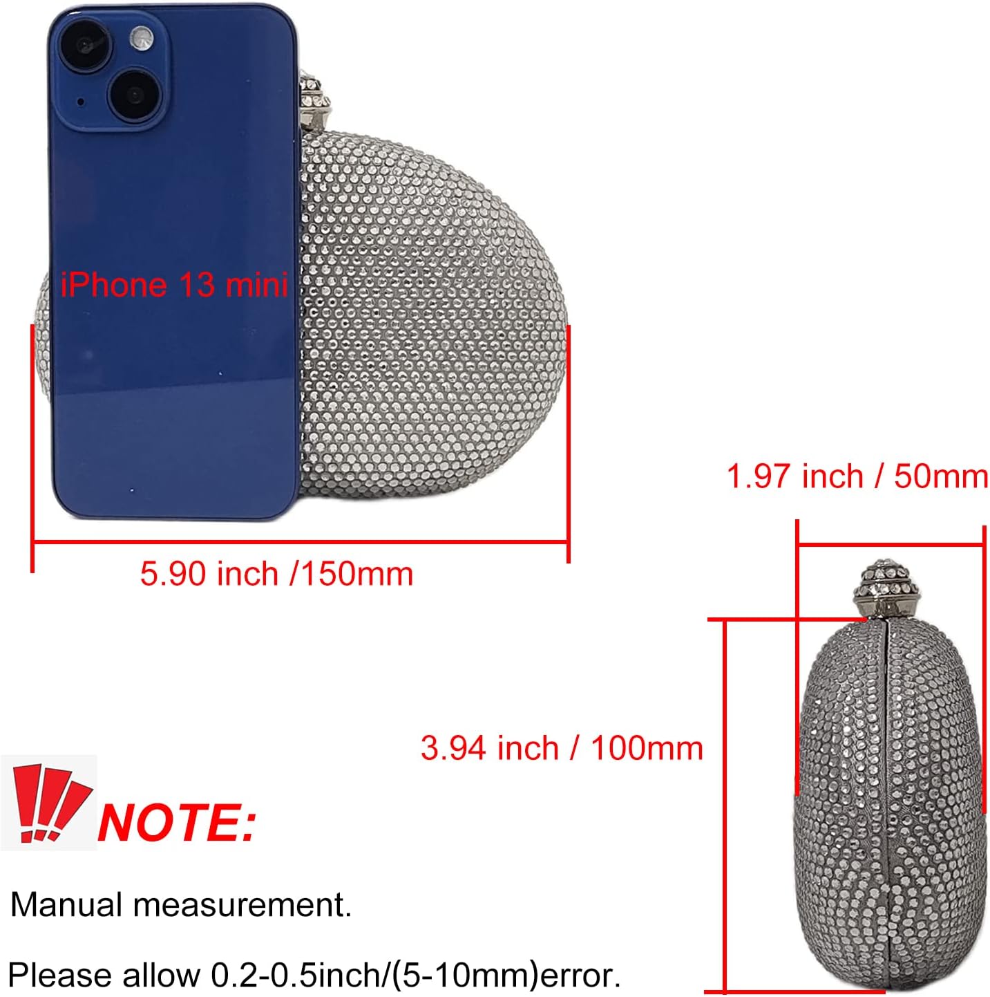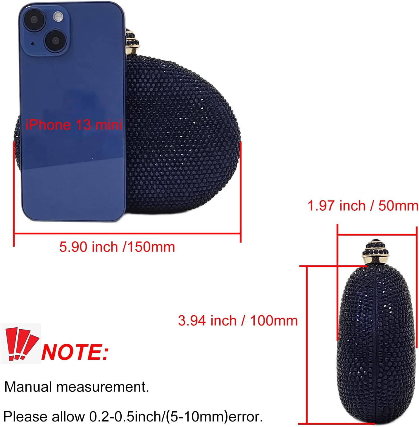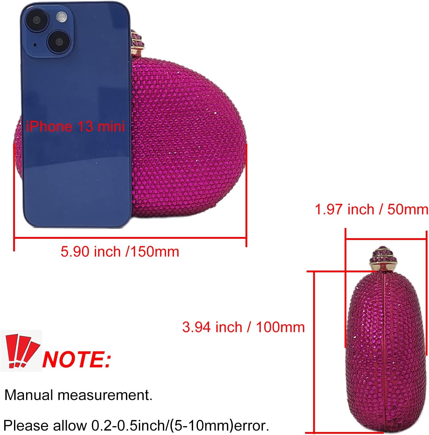 - ●Size & Capacity.● This is a Locking type evening bag. Dimensions: L5.90 x H3.94 x W1.97 inches, about 15 x 10 x 5cm. It has a Small capacity, Can NOT hold Iphone 13 mini, BUT it can hold keys, credit cards, lipsticks or other small things. Charming and dazzling appearance,about 0.60 pounds (0.27 kg), very easy to hold in the hand.