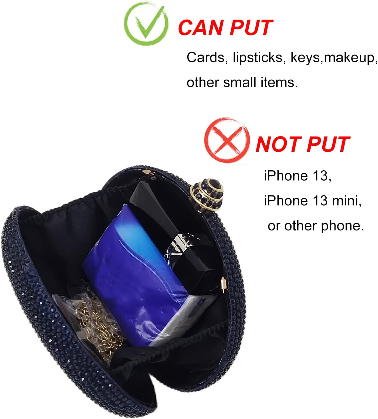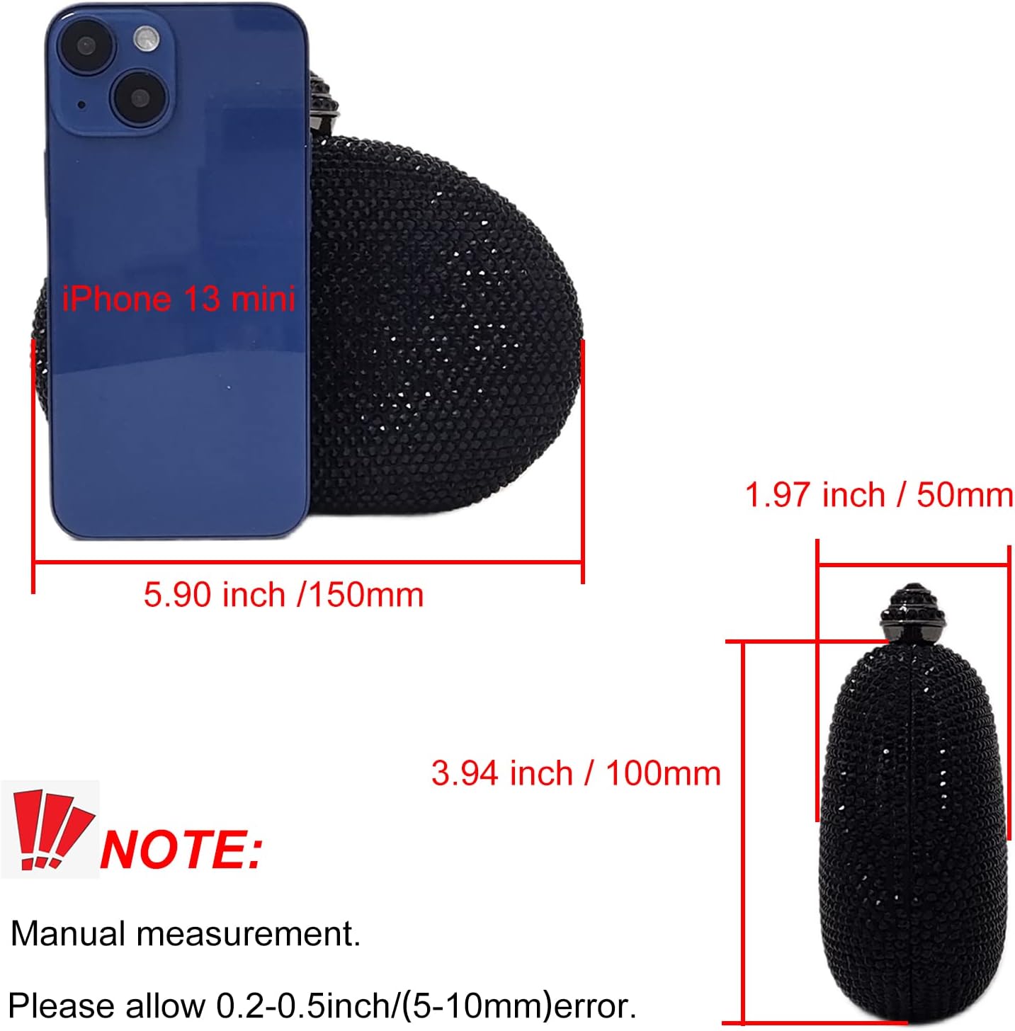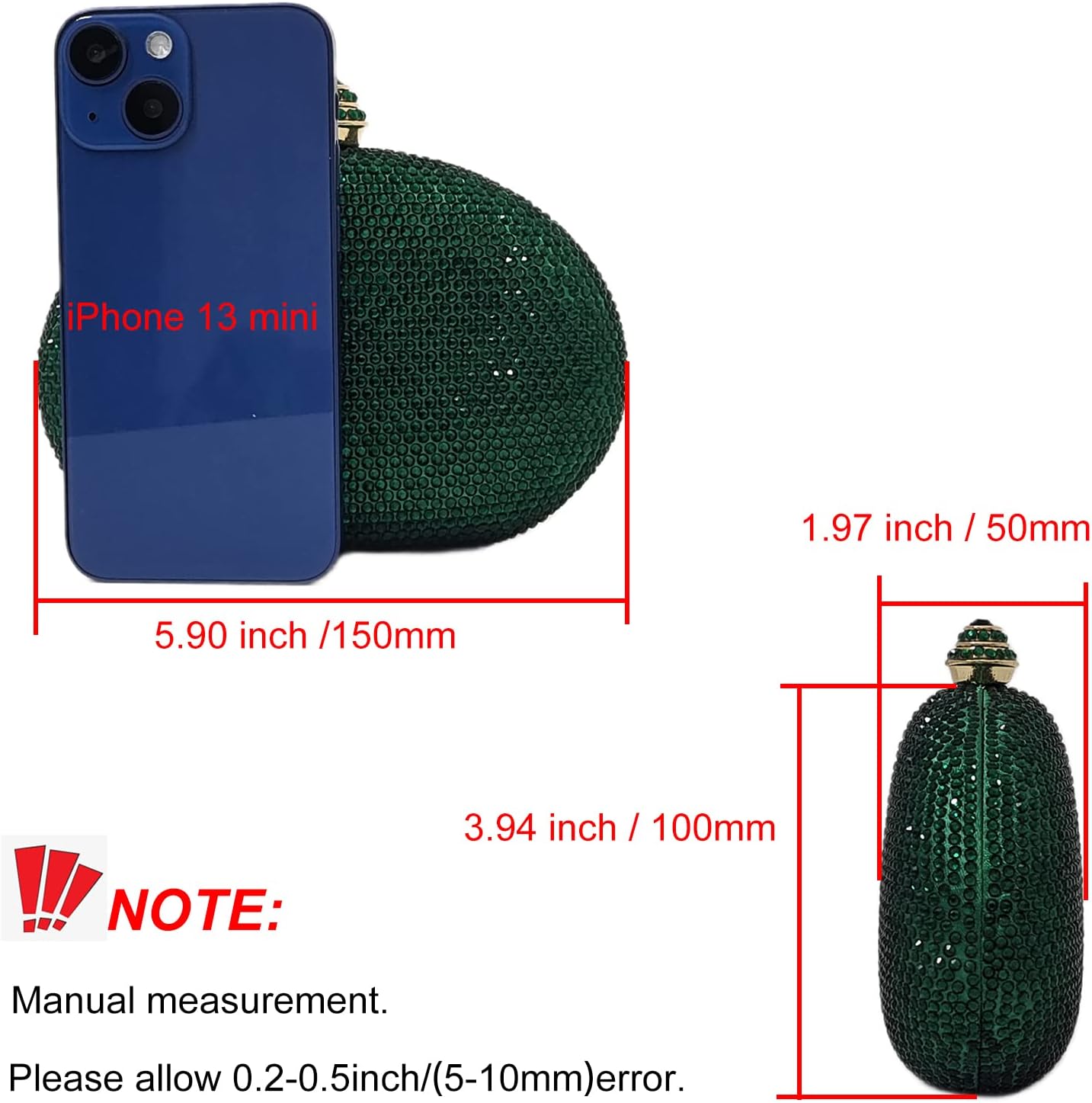 - ●Size & Capacity.● This is a Locking type evening bag. Dimensions: L5.90 x H3.94 x W1.97 inches, about 15 x 10 x 5cm. It has a Small capacity, Can NOT hold Iphone 13 mini, BUT it can hold keys, credit cards, lipsticks or other small things. Charming and dazzling appearance,about 0.60 pounds (0.27 kg), very easy to hold in the hand.