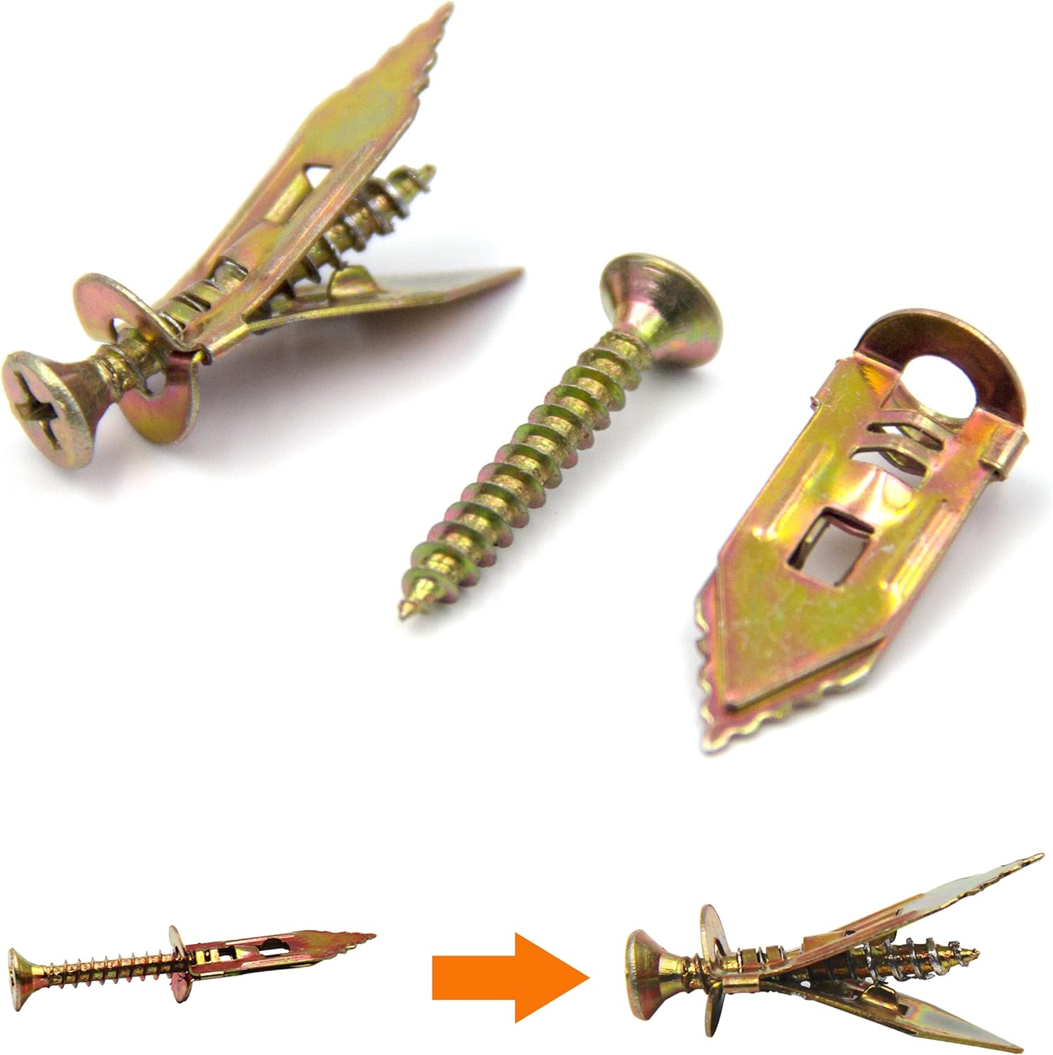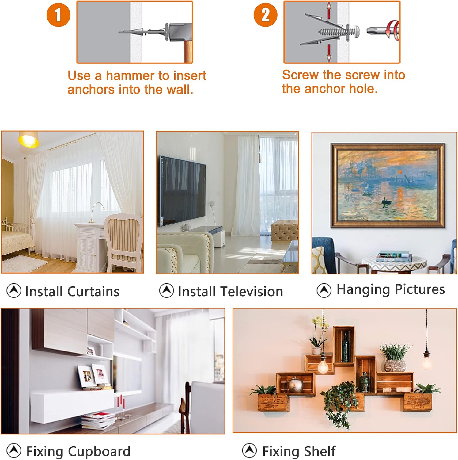 【EASY TO USE】No drill or holes in wall. You just need a hammer to strike the anchor into the wall and then screw the screw into the anchor hole. It will expand into two opposite sides, which can increase holding power, anti-rotation and with high stability.