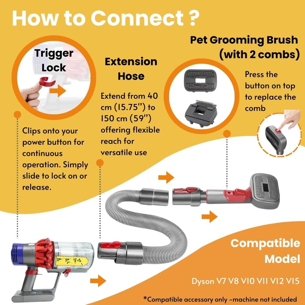• 【Extension Hose】Up to 60 Inch,easily extend to reach more area. Save your time and make cleaning more convenient.【Switch】Fitted to the vacuum cleaner's button, it'll automatic boot,your hand free.When you use the pet brush, Slicker bristles positioned at 35 degree to protect pet form damage during hair cleaning process. After using the dyson groomer tool, the bristles retract for accidental scratch.