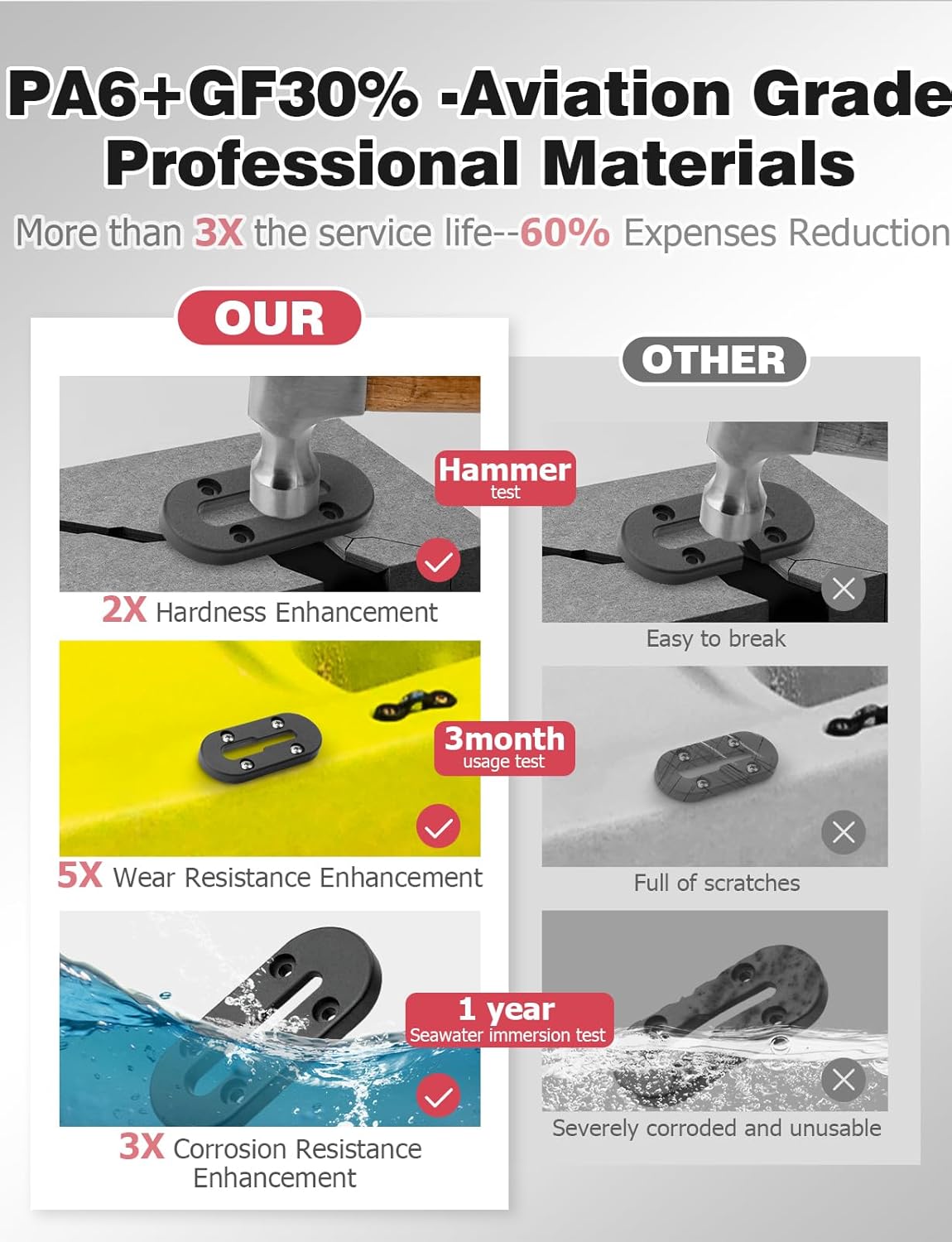 Unmatched Durability: Crafted from PA6+30% Glass Fiber, this material is renowned for its exceptional strength and durability, making it widely used in the aerospace industry. This means our kayak tracks are incredibly sturdy and built to last. You can confidently place your gear on our tracks without worrying about damage or frequent replacements. This significantly reduces your costs, allowing you to fully enjoy your kayaking experience without the hassle.