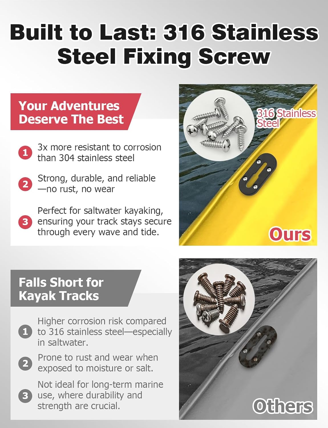 316 Stainless Steel Screws: Our kayak rail mount features 316 stainless steel screws, offering superior hardness and 3x better corrosion resistance than 304 stainless steel. Unlike standard screws that rust and weaken, our 316 screws resist rust, keeping your kayak looking great and the kayak track securely fastened. This helps minimize the need for frequent replacements, saving you time and money.