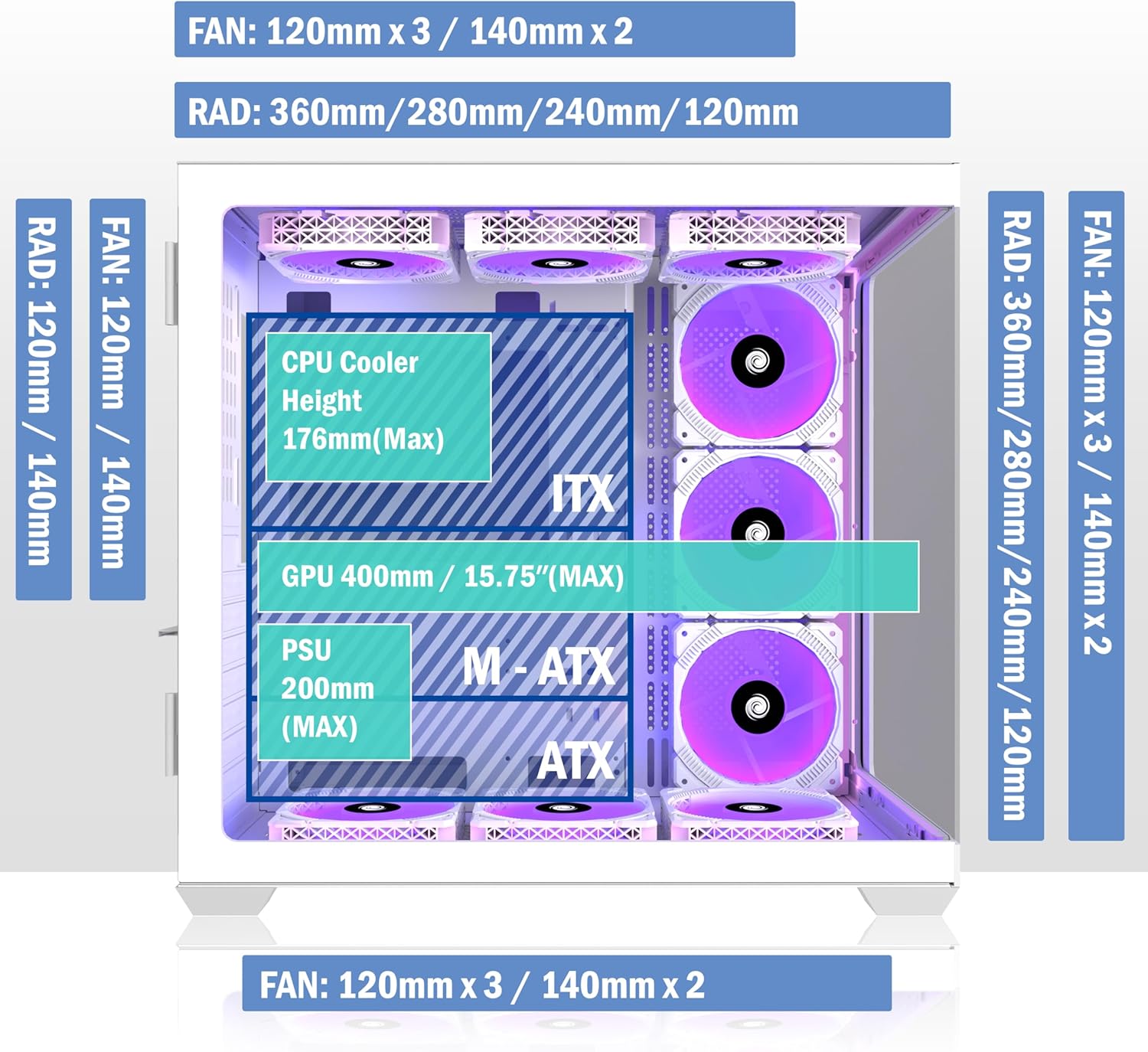 Compatible Devices ATX, Micro-ATX, Mini-ITX motherboards, 7+3 expansion slots, 360mm radiator, CPU cooler up to 170MM, GPU up to 410MM