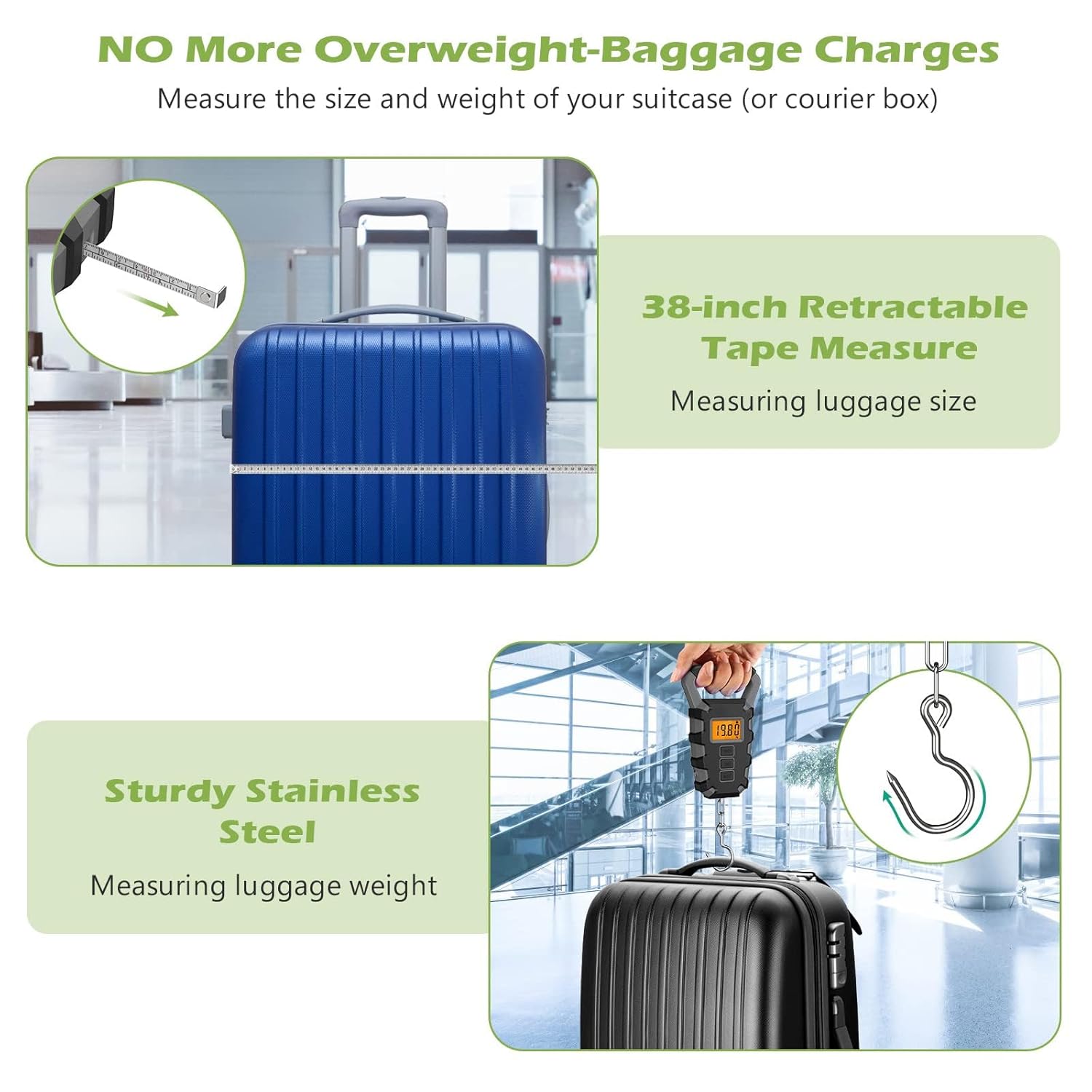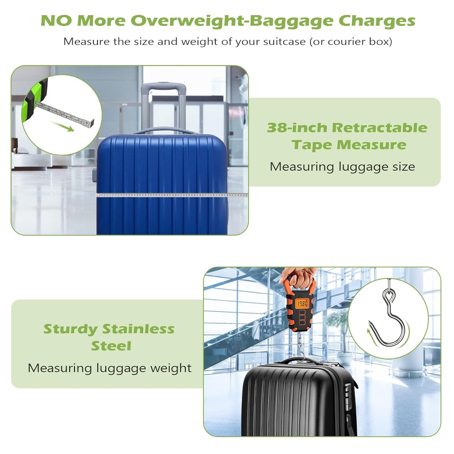【Tape Measure Design】Not just a fishing scale, it comes with a 38-inch retractable tape that allows you to weigh a fish and measure its length at the same time. Also, use it to check luggage size, measure shipping packages, outdoor fishing and more, which is suitable for various occasions.