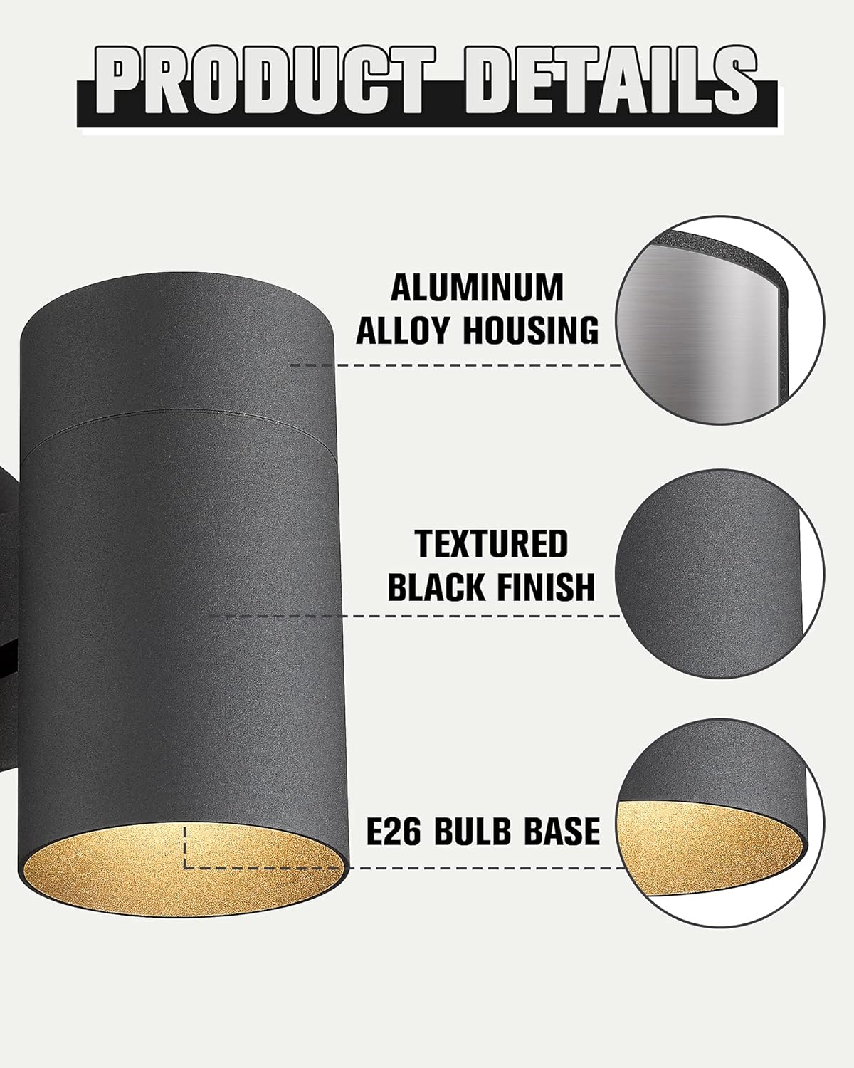 Waterproof IP65: IP65 rated outdoor wall sconce, built-in waterproof gasket protects the light, which significantly prevents the lamp body from water ingress. It Constructed of heavy-duty sturdy die-casting aluminum, this wall lamp is shock and resistant to corrosion, ensures your sconce fixture is protected against all the weather elements, making it has a long lifespan.