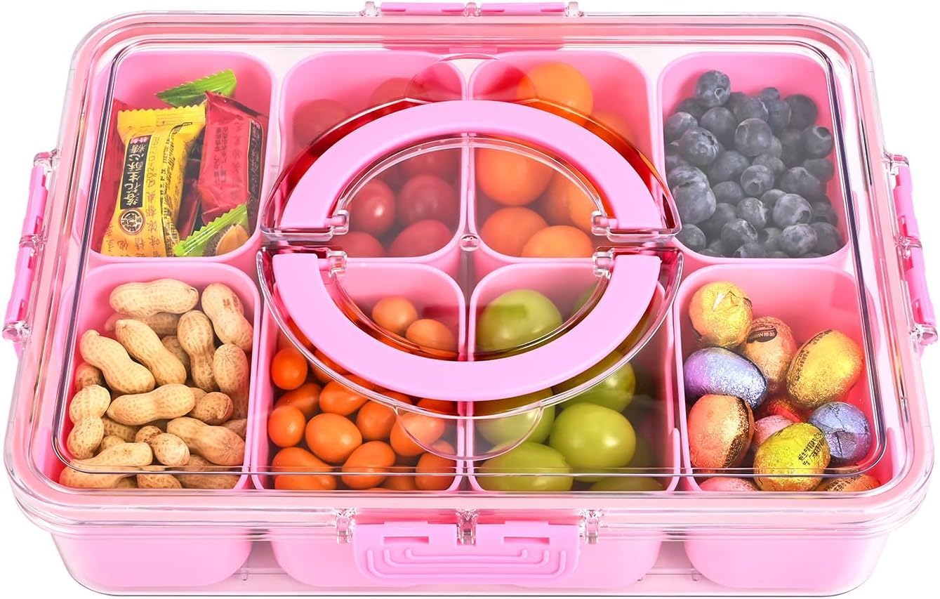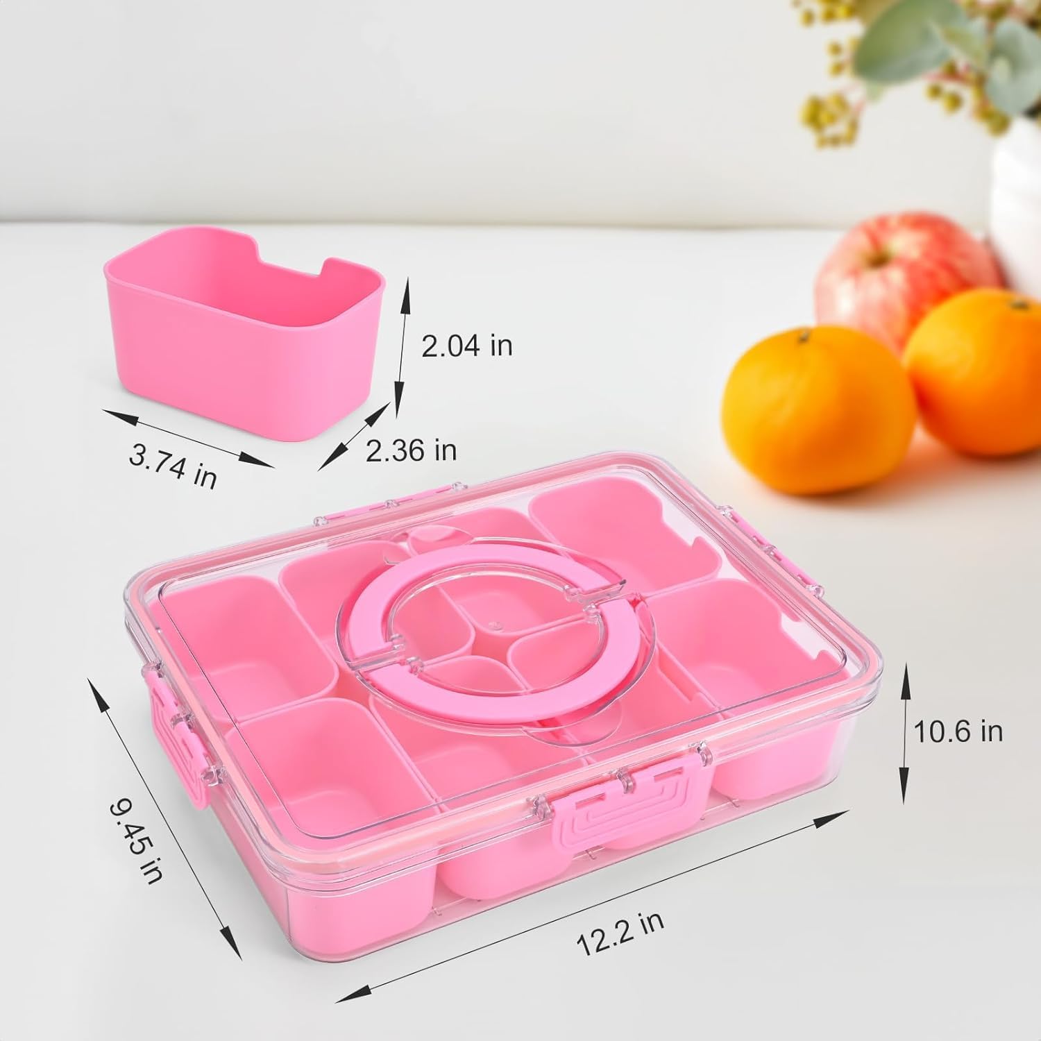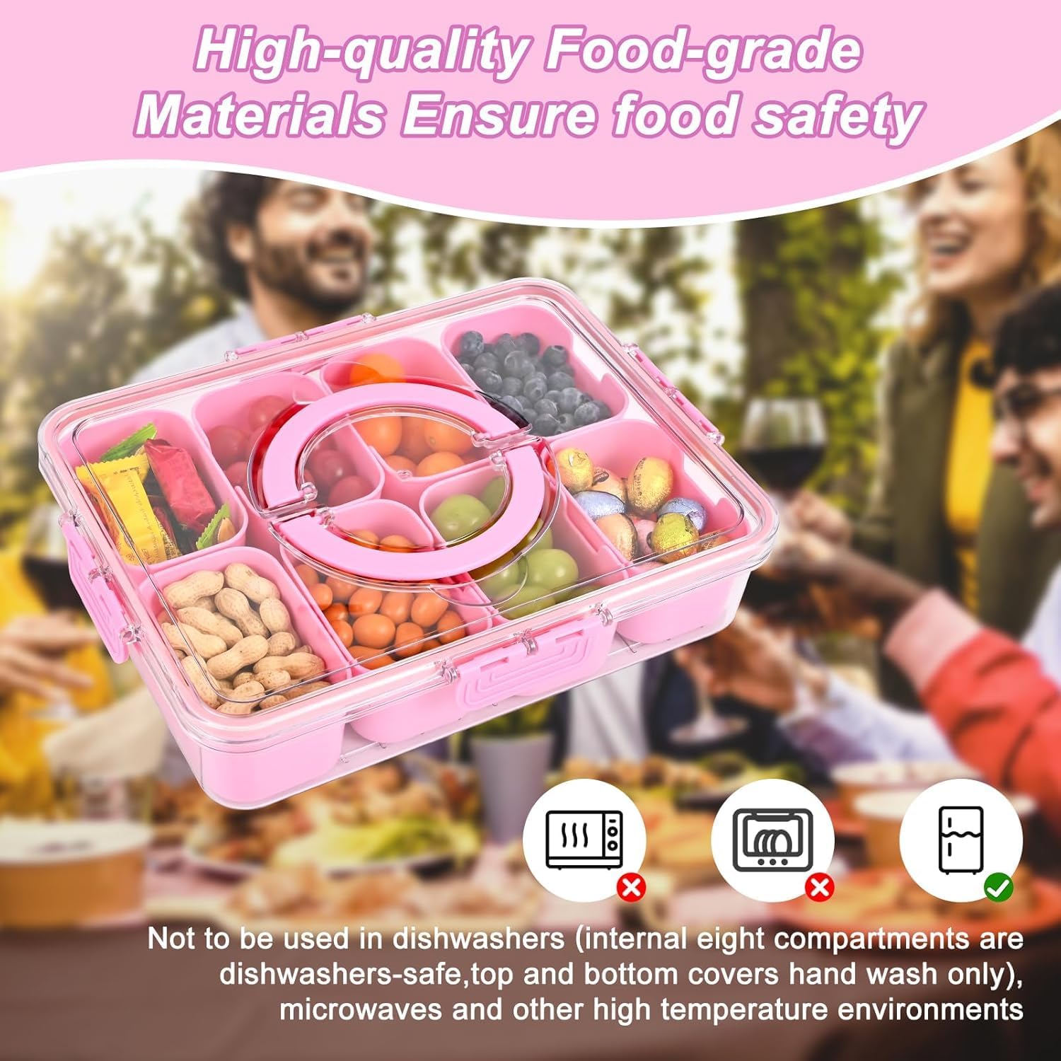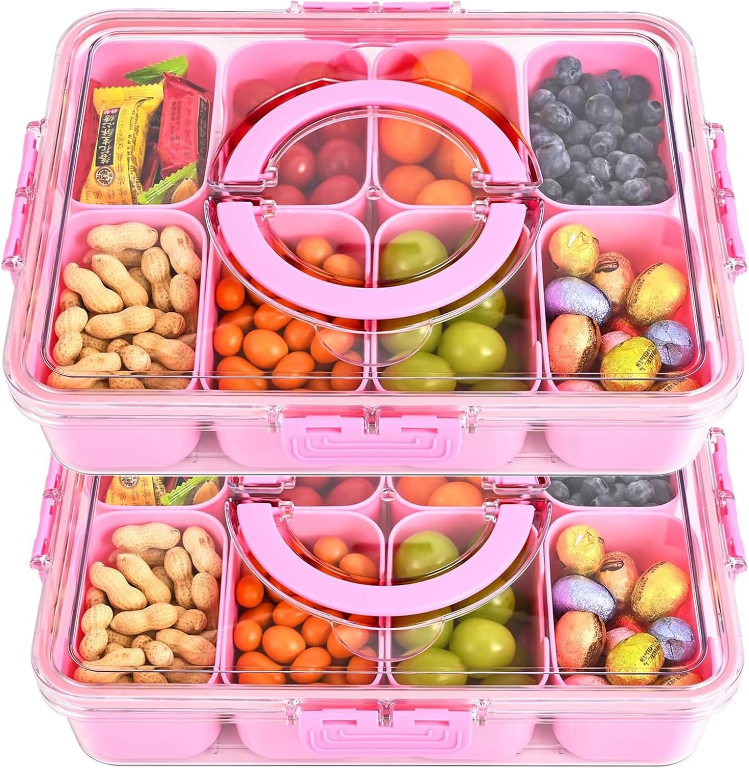 KIGITIONE Snackle Box, Pink 8 Compartments Portable Serving Tray, Divided Snackle Box Container with Lid and Handle, Snack Organizer for Fruits, Snacks, Nuts, Candy, Ideal for Party, Travel & Picnics