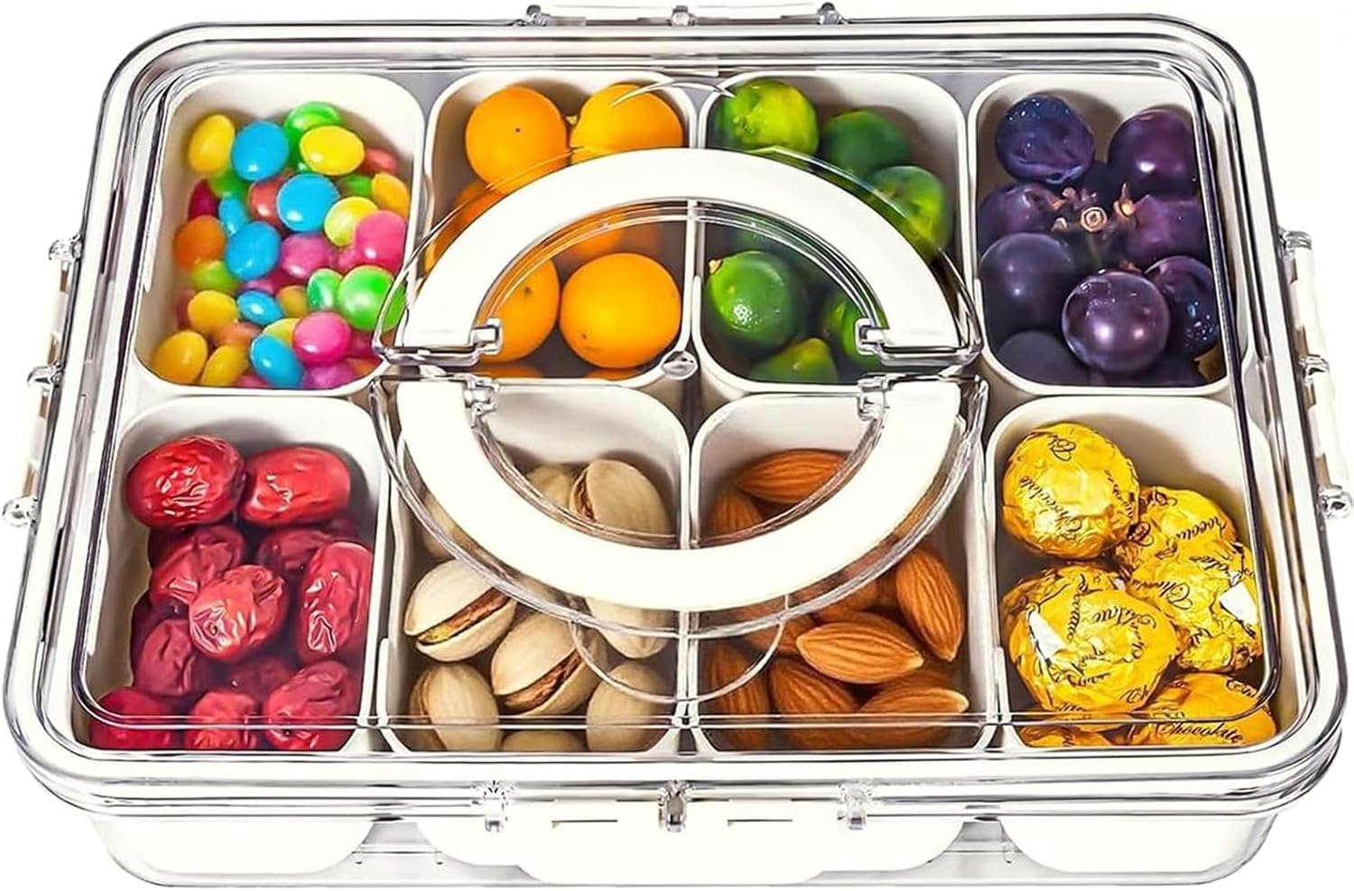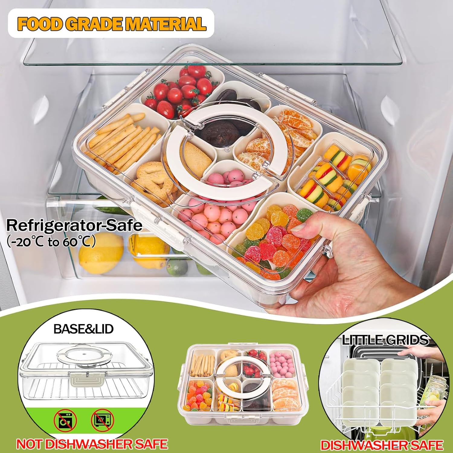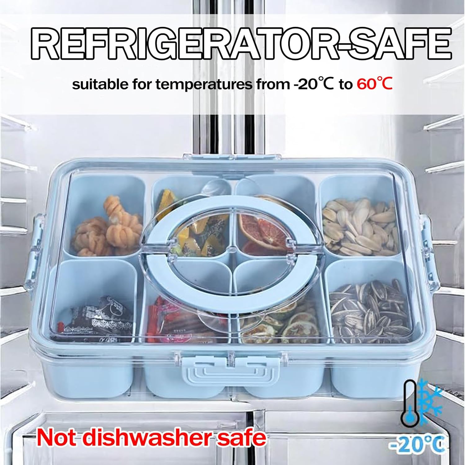 【Easy Carry Foldable Handle】 This divided serving tray comes with a lid and handle, 8 Compartments-Portion out your favorite fruit snacks and they won't get mixed up. And the silicone sealing ring will keep fresh. Whether you're on the train, on holiday at the seaside or at a picnic, our snackle box is easy to carry