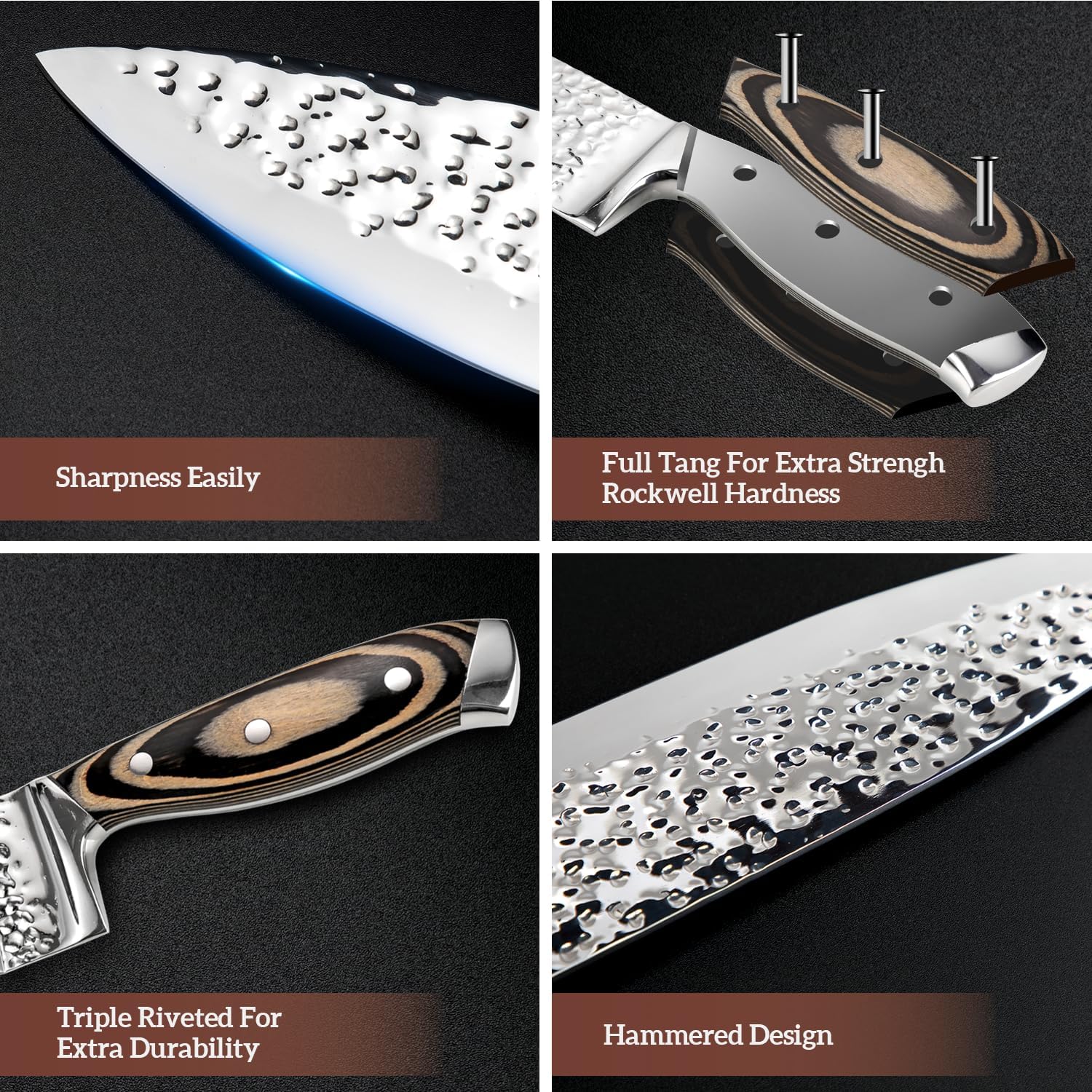 Unique Pattern & Anti-Rust - The unique delicate hammer pattern design can effectively prevent food from sticking and cutting more smoothly, The precise forging process makes the steel finer-grained, making it stronger and harder. This knife block set is durable, anti-rust, and stain resistant, never worry about breaking off.