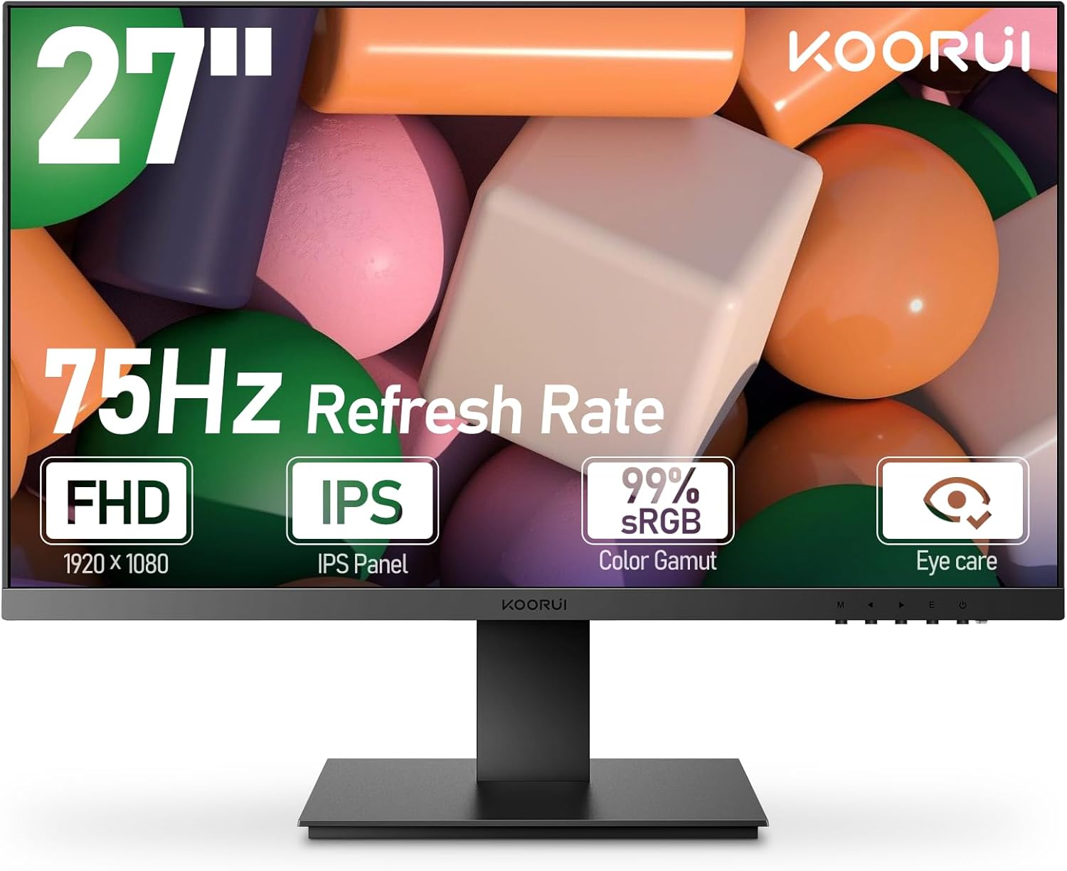 KOORUI 27 Inch Full HD (1920 x 1080) Monitor, 75Hz 5ms IPS Gaming Office Computer Monitor,HDMI,VGA & Audio Port, Tilt Adjustable, VESA Mountable, 27N1