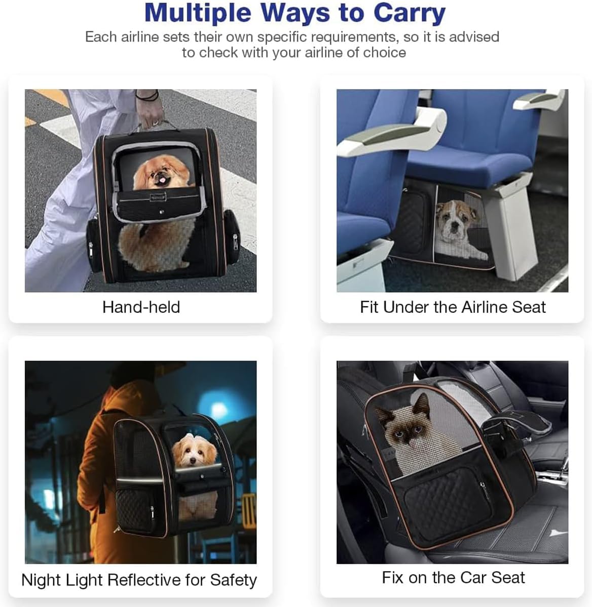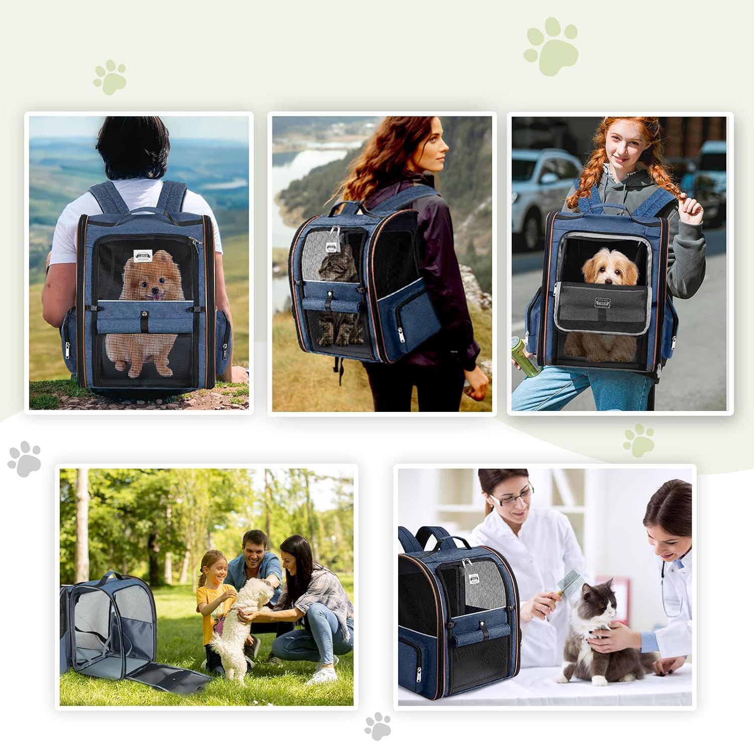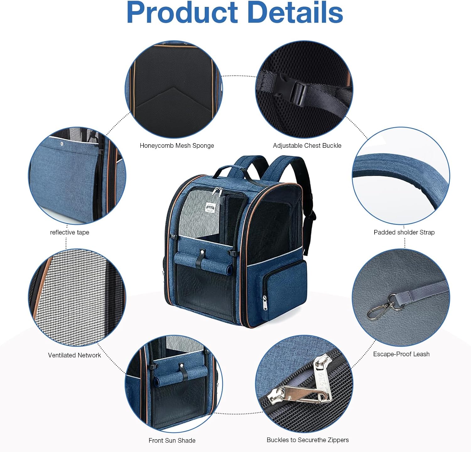 - Air Circulation : Cat carrier backpack with Mesh windows on 4 sides for optimal airflow, 4 entrances (sides, front, and back) allow your pet to enjoy the outside scenery and easy entry into the carrier, and 1 expandable soft mat to keep your pet comfy during the journey.