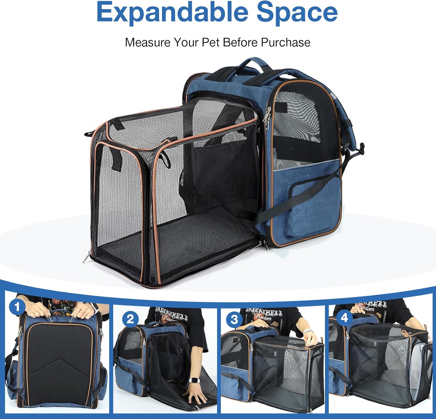- Expandable & Collapsible: This airline approved pet carrier with an expandable back allows your pet to move around more comfortably and reduces the anxiety. And the carrier can collapse flat when not in use. Measures 13x9.8x16.5 inch, easily fits most small/medium-sized pets, weighing up to 18 lbs.