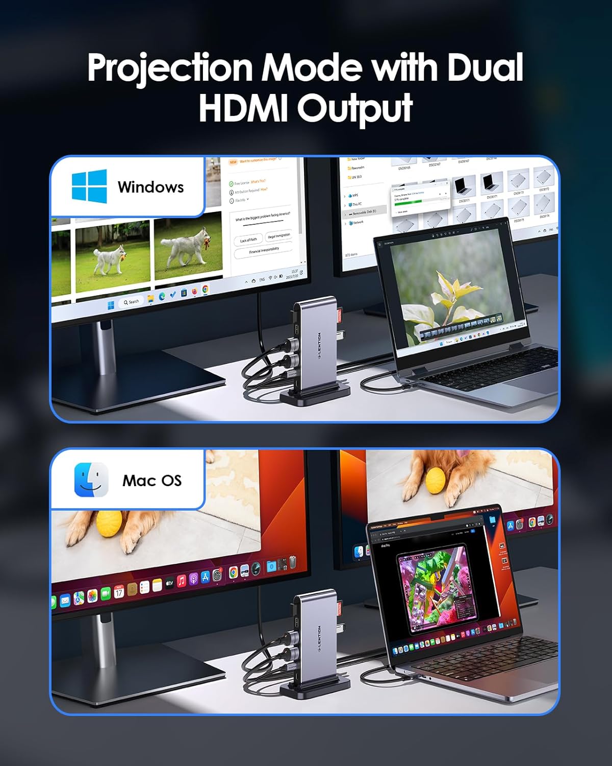 This laptop Docking Station with 2 HDMI ports(4K@60Hz), supports dual monitors in extended or mirror mode. Boost productivity with our usb c dual hdmi supporting SST or MST mode under Windows Laptop for extending two monitors simultaneously. Please note: Only mirror(SST) mode (identical screens of external monitors) is supported on MacOS system, Extended mode(MST) is not supported.