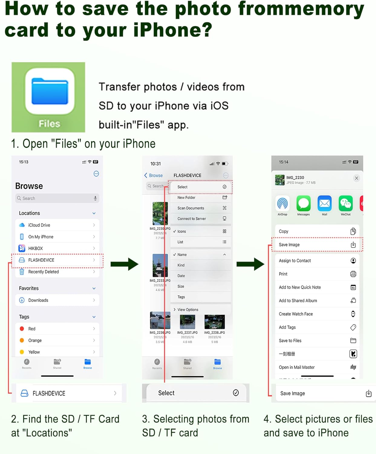 【Dual Card Slot Design】This SD/Micro SD card reader for iPhone features a bi-directional transfer function that allows you to easily transfer data between your SD card and iPhone. If nothing happens when you insert the card or camera, simply go to "File" on your phone's desktop and click "Browse" to view the contents of the card
