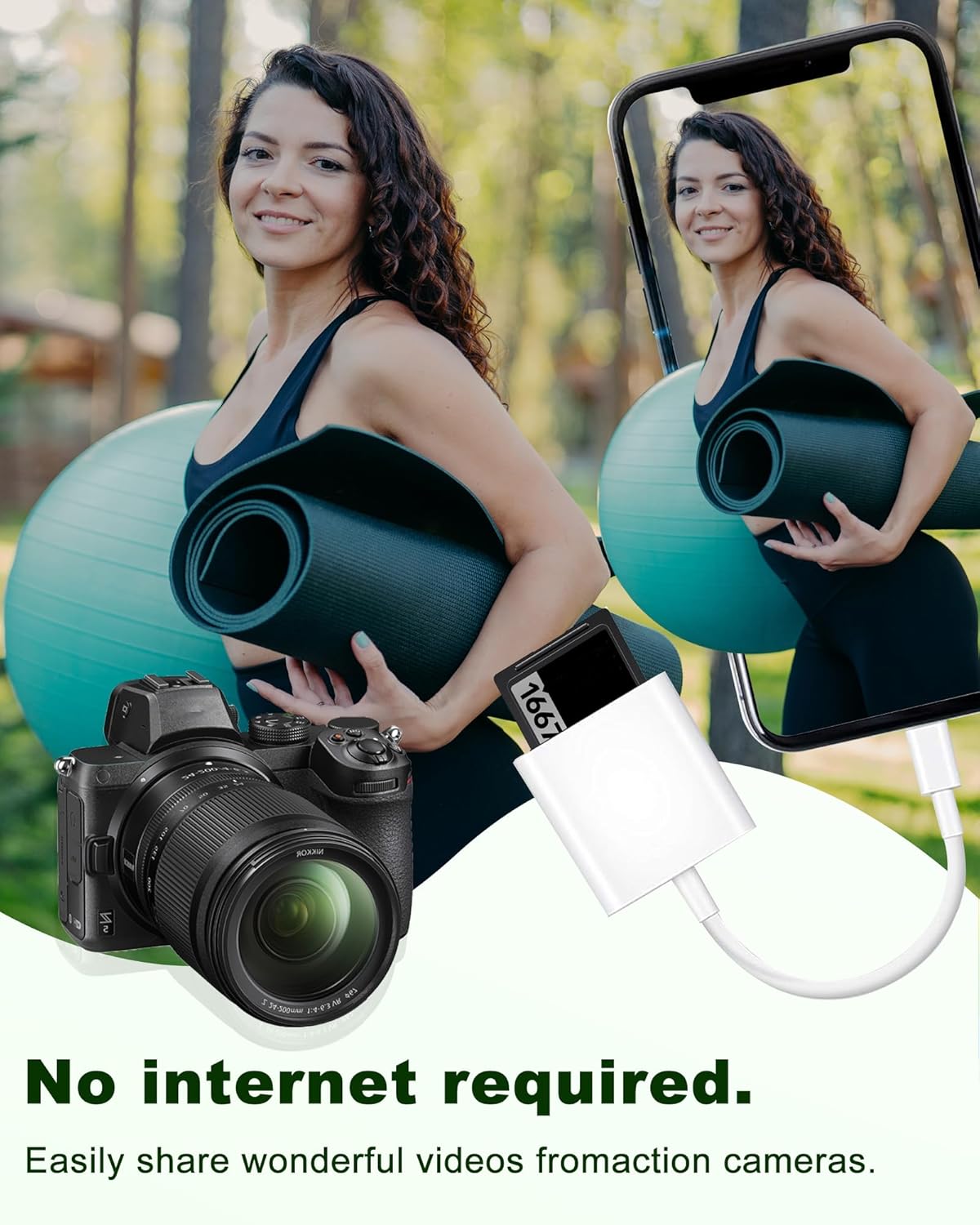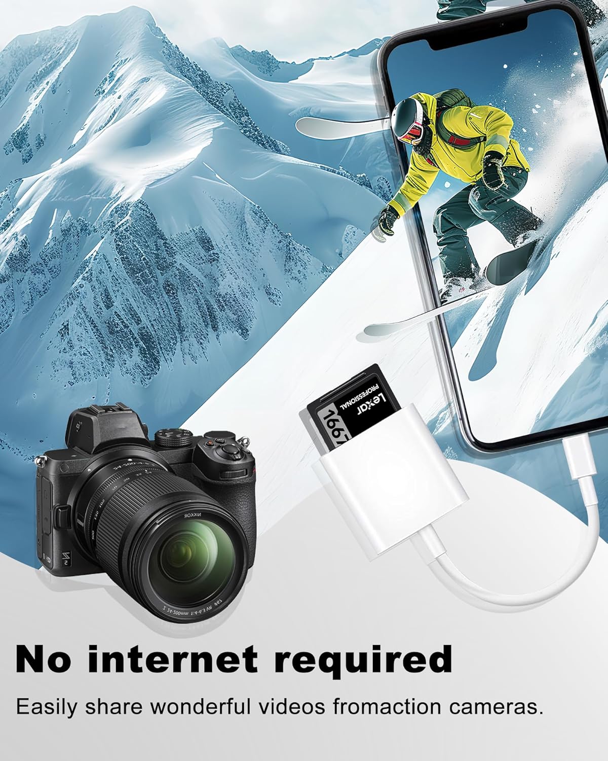 【Upgraded SD Card Reader for iPhone】This lightning to sd card reader supports sd memory card with capacity up to 256GB, It's easily download photos or videos from SD cards directly to the iPhone or ipad,and share photos or videos on social media anytime and anywhere