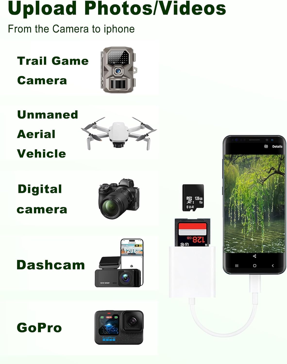 【Formats and Capacity Support】:The lightning to memory card Converter supports standard photo formats (including JEPG and RAW) and SD and HD video formats (including H.264 and MEPG-4). supports sd cards from Digital Camera, Sports Camera, Drone, Trail game Camera. This SD card to Phone adapter allows you to share the great moments to social media in real time