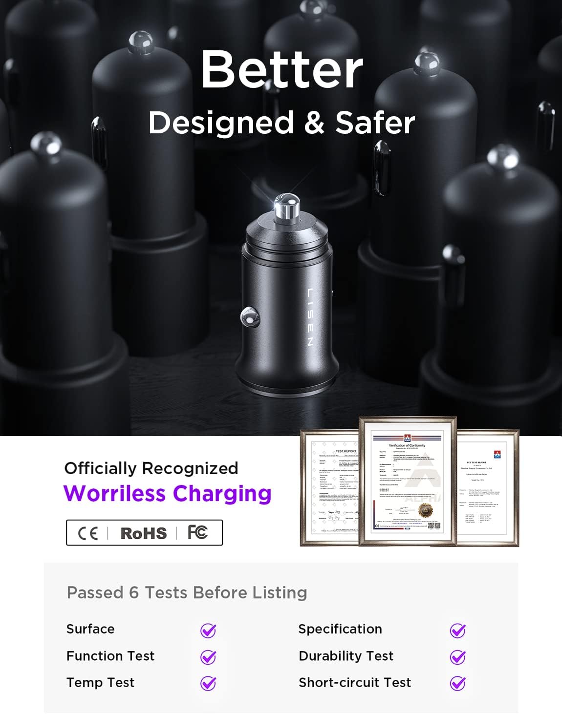• 2 Fast Charging Ports: LISEN fast charging USB C car charger supporting PD 30W(Max) and QC 18W(Max) high output, can fast charge all prevailing phones and E-devices. This USBC car charging with both of USB-A and USB-C ports can work with all kinds of plugs cables. NOTE!!!: The type c car charger CANNOT fast charging 2 devices simultaneously.