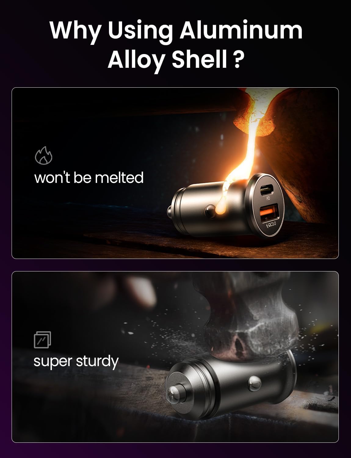 • All Aluminum Metal Body: The high-density aluminum alloy shell can help the USB C car adapter to dissipate heat in the charging process, effectively improving the charging efficiency by about 15% compared to plastic car chargers, and absolutely no melting and danger. The all-metal body also has a unique sense of design and luxurious texture.