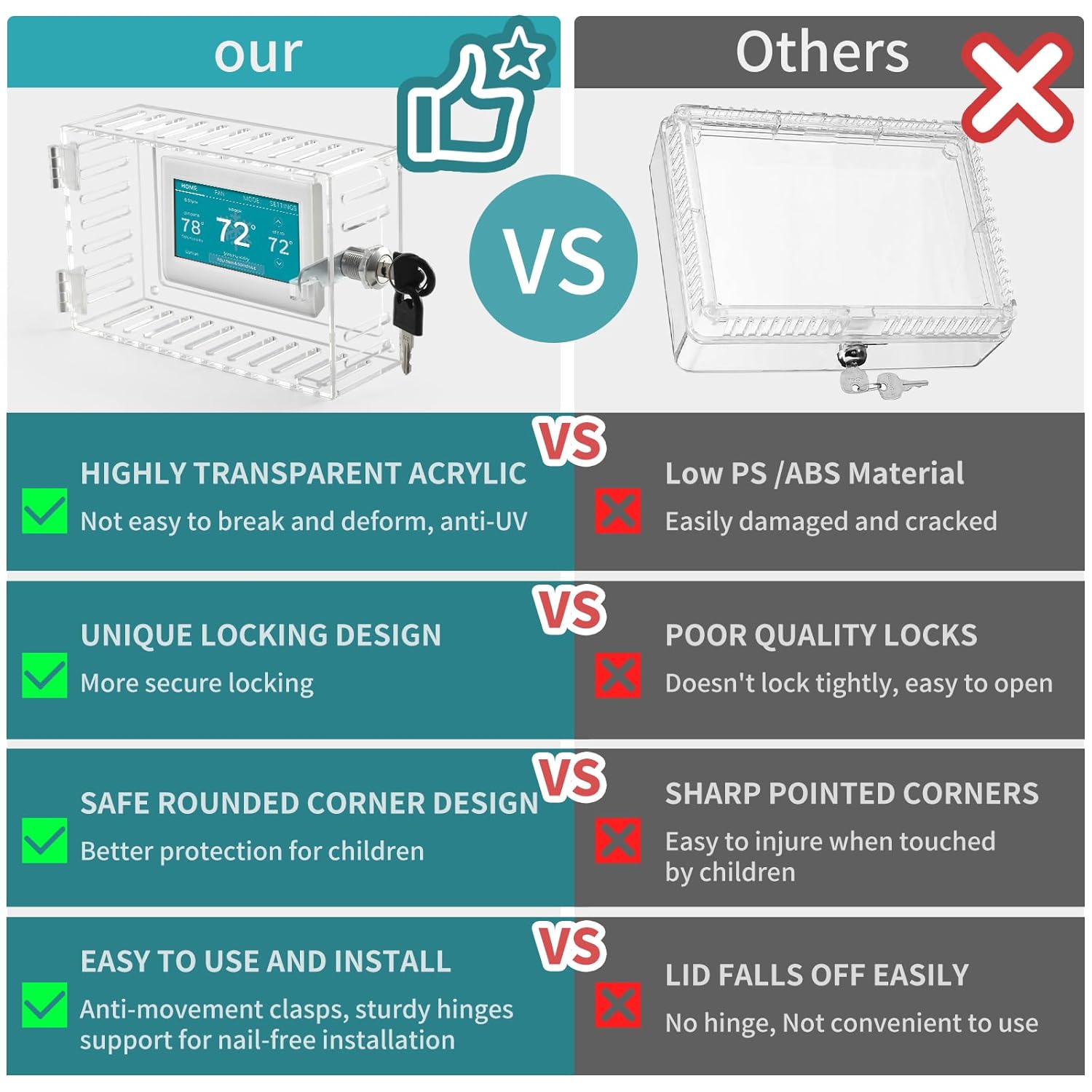 • STURDY AND DURABLE THERMOSTAT PROTECTION BOX: Transparent thermostat lock box is made of high quality acrylic material, superior to plastic thermostat lock box, not easy to be deformed and broken, corrosion-resistant, UV-resistant, and will not yellow even after a long time of use, keeping the inside clearly visible.