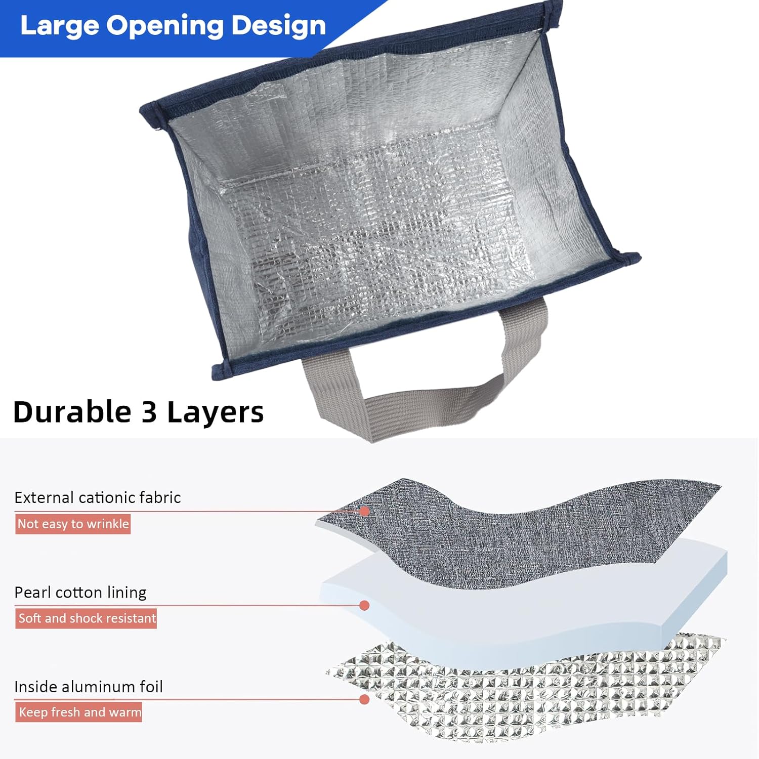 Our lunch bag is made of cationic fabric on the outside, which is durable and waterproof. The middle layer is 5mm pearl cotton, and the inside is aluminum foil, which is 100% non-toxic and does not contain BPA