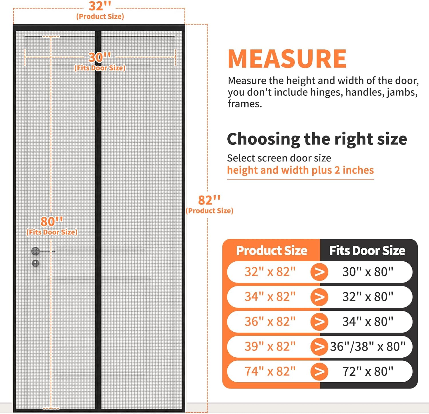 - Product Size: Magnetic screen door measures 39 inches wide and 82 inches high, and fits door size up to 36-38 inches wide and 80 inches high(excluding the door frames).