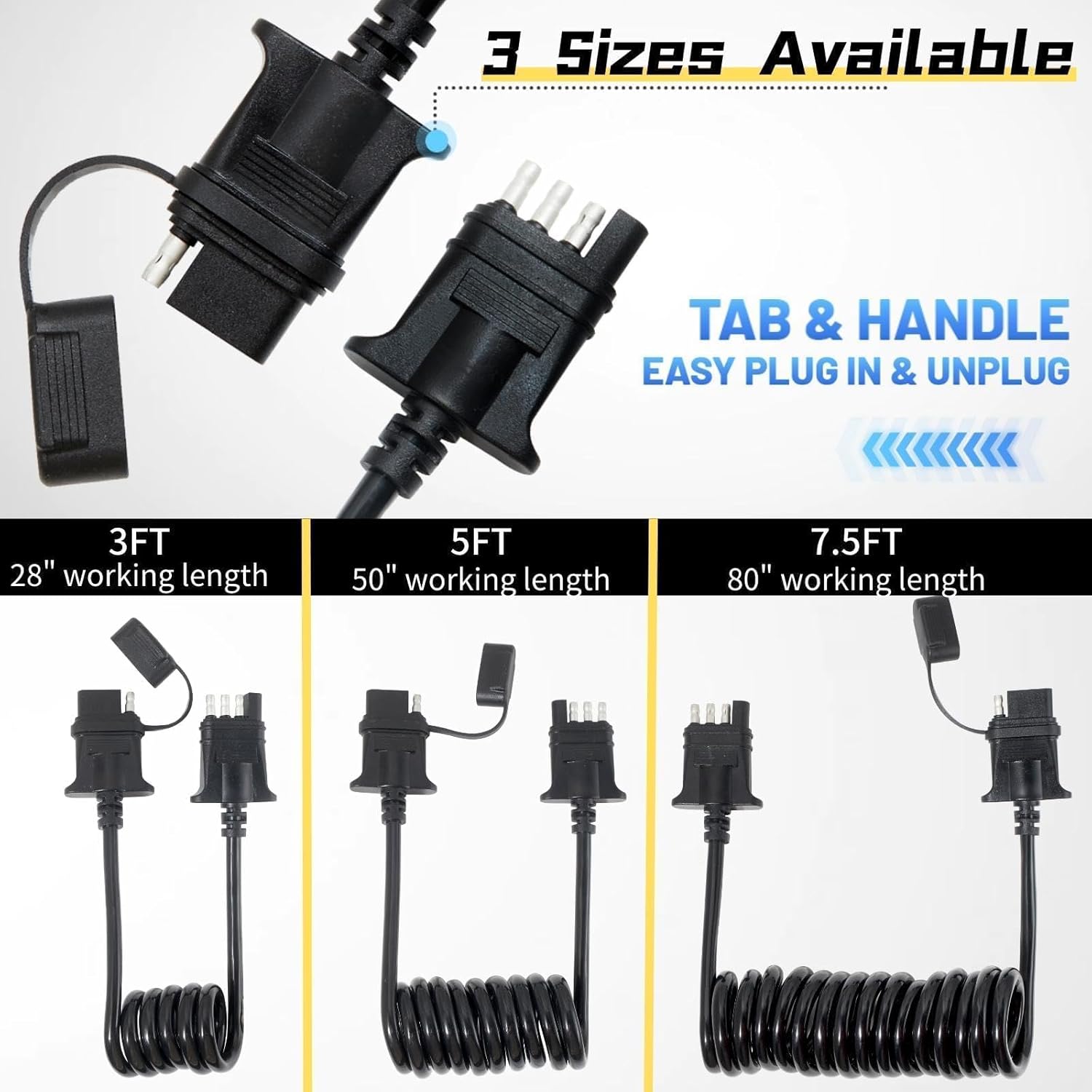 - Coiled Design: Flat 4-pin Coiled cable design wiring keeps wire from dragging; Stretchable coiled wire with 3' maximum length provides sufficient space and flexible for towing vehicle and trailer