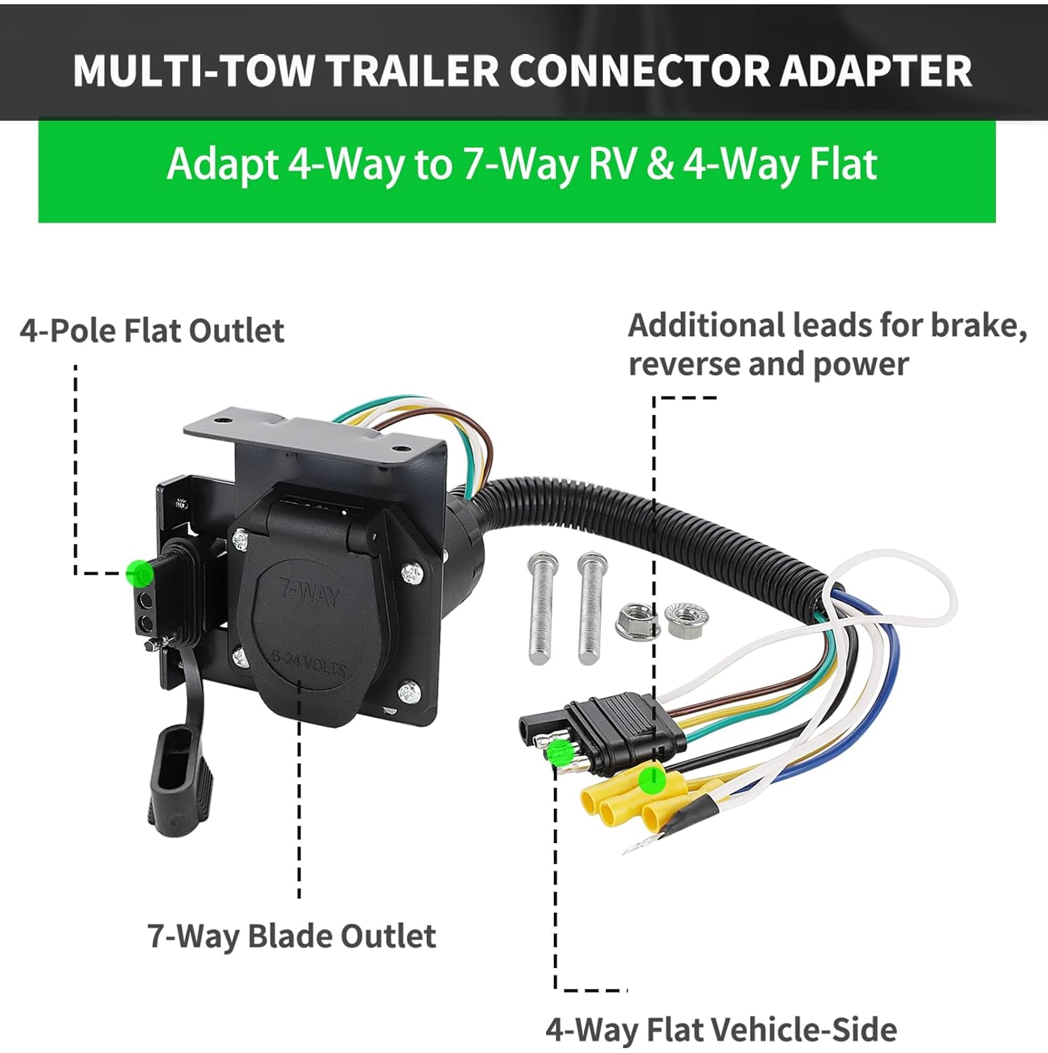 - Multi-Plug: Dual-output 4 pin to 4 and 7 pin trailer wiring adapter provides multiple tow options from one vehicle-end connector for towing different trailers; Additional leads for brake, reverse and power function, converts vehicle side 4-pin factory socket to a combination 7-pin rv and 4-wire flat