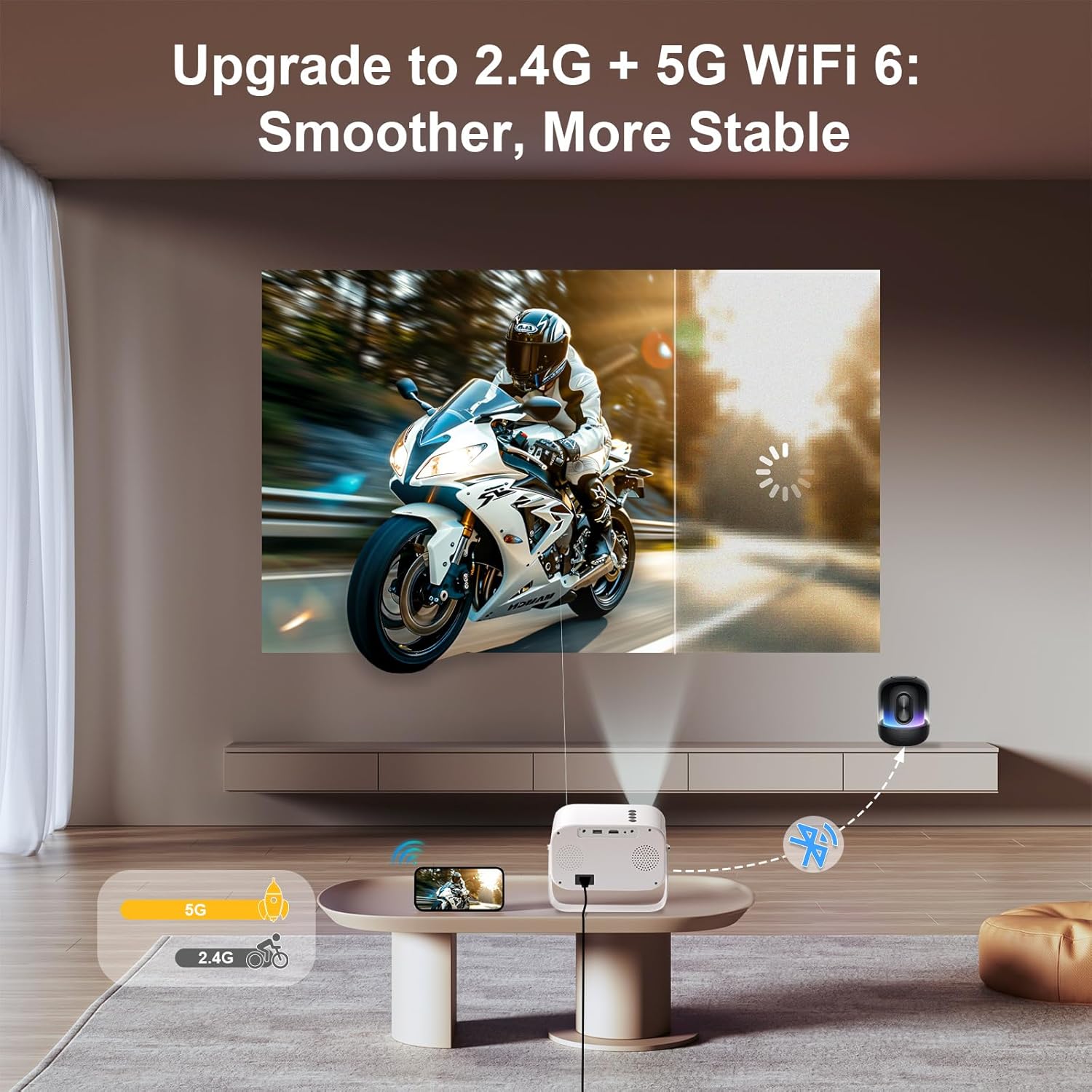 Mini Projector 1080P HD with 3s Remote Focus & 360° Rotation Stand - WiFi 6 & Bluetooth 5.2, Auto Keystone, Perfect for Travel & Home Theater, Compatible with Phone/PC/TV Stick/USB/HDMI