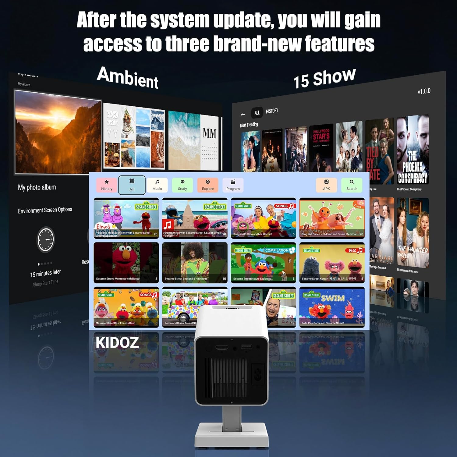 - Functional updates include educational content (KIDOZ), trending videos, and ambient modes