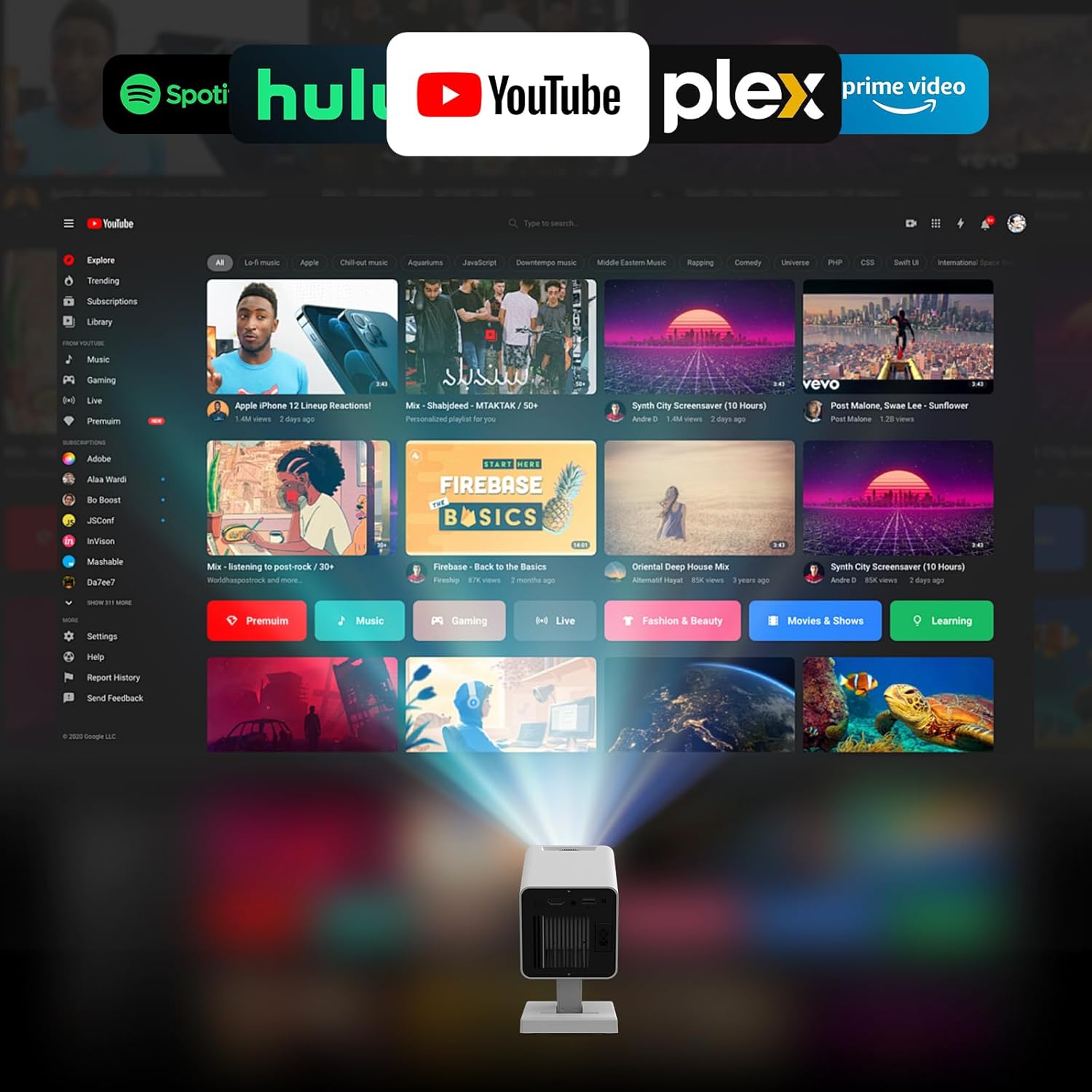 Experience immersive home cinema anywhere with the Pisodawn Mini Projector 4K Portable, designed for movies, gaming, business presentations, and streaming. Equipped with WiFi6 and Bluetooth 5.4, this smart projector connects effortlessly to your phone, PC, laptop, or USB device, delivering high-quality visuals and crisp audio.