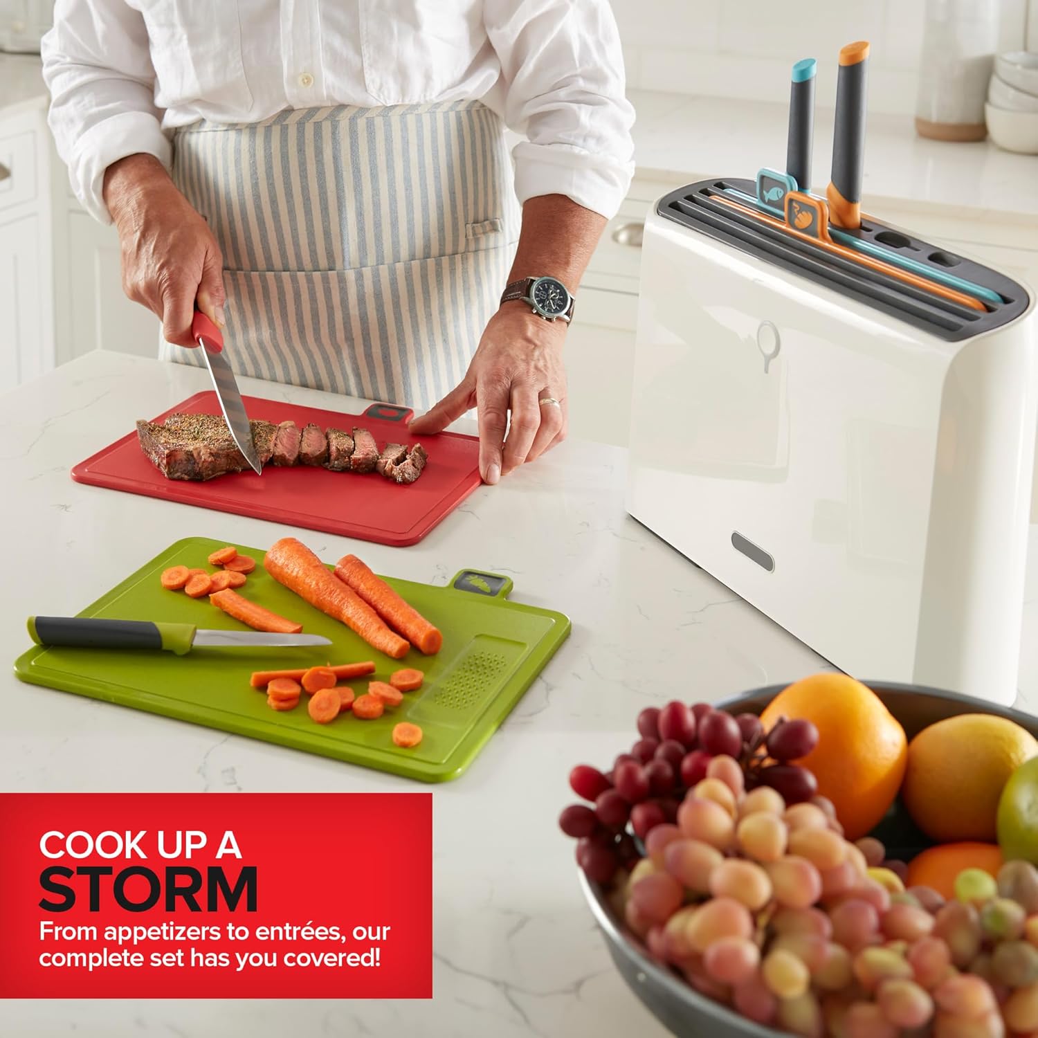 • Complete Set: Slice and dice your entire meal from appetizer to main entrée with our complete cutting board and knife set. Prevent mixing of foods and make food prep a breeze with our easy to understand color coded cutting board set with knives.