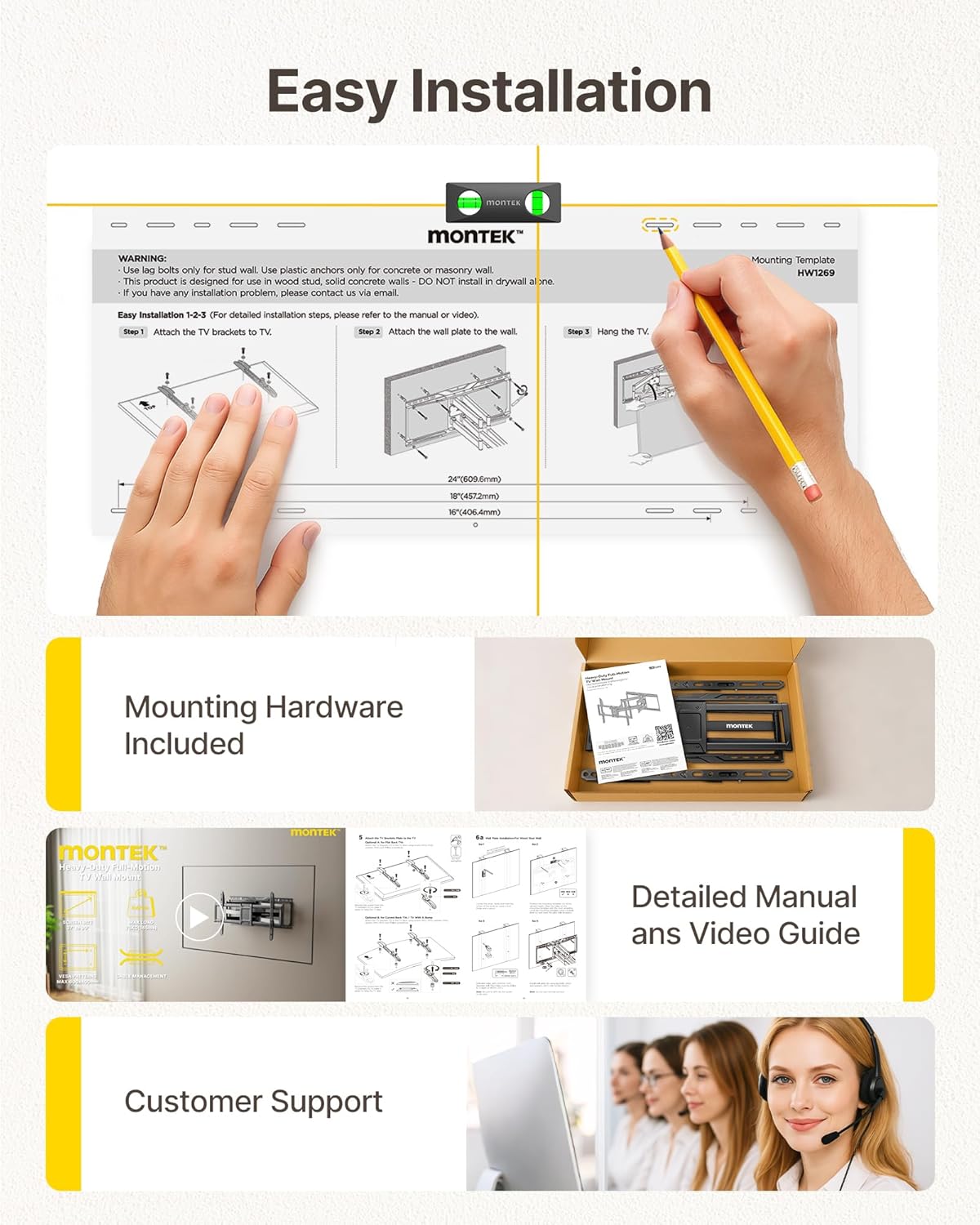 - monTEK Full Motion TV Wall Mount for Most 37-90 inch TVs up to 165 lbs, Heavy Duty TV Mount with Dual Articulating Arms, Tool-Free Tilt, Swivel, Extension, Fits 16"/18"/24" Studs, Max VESA 600x400mm