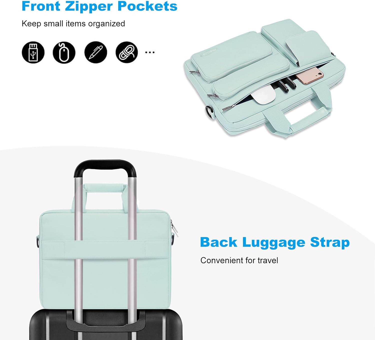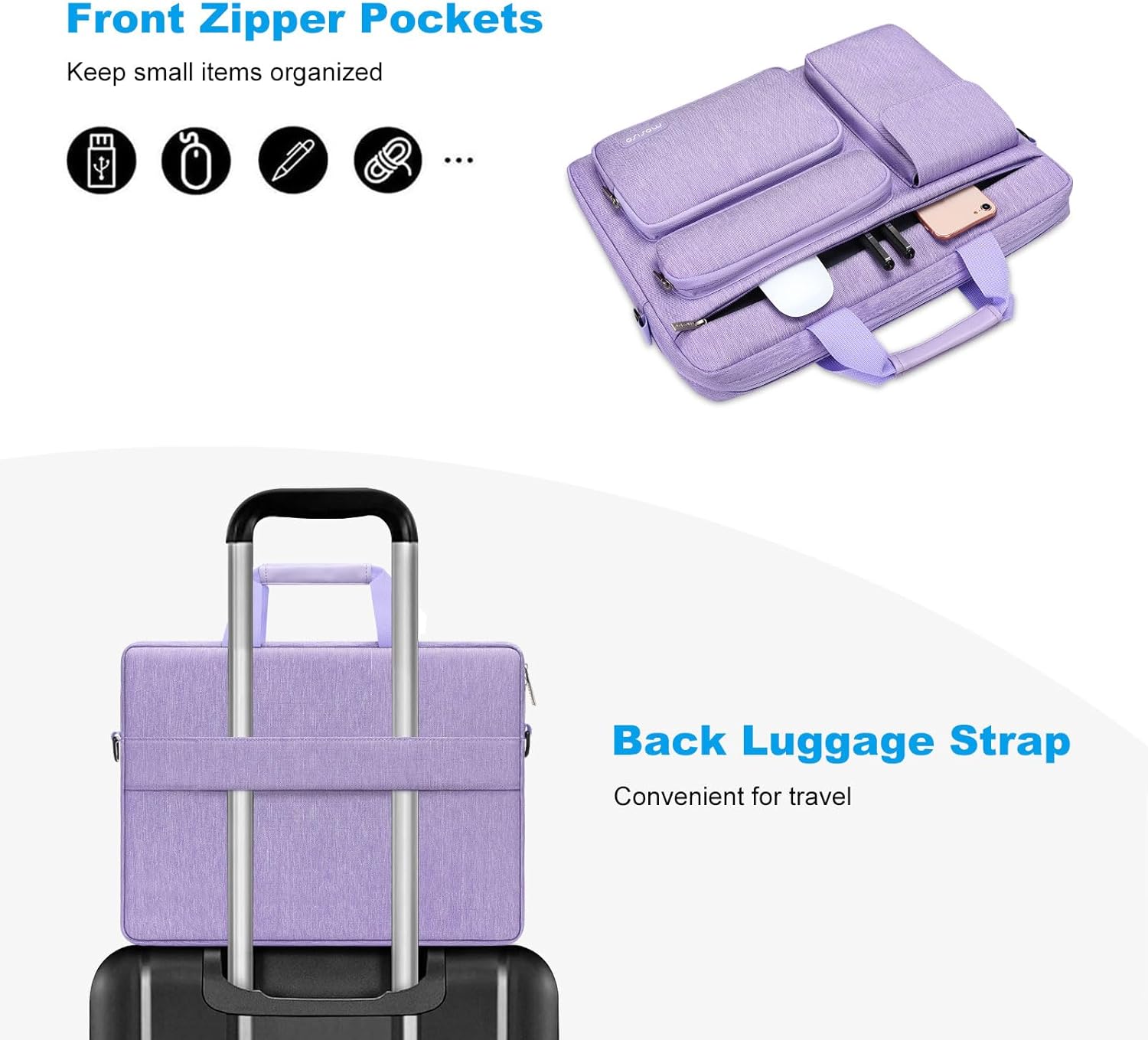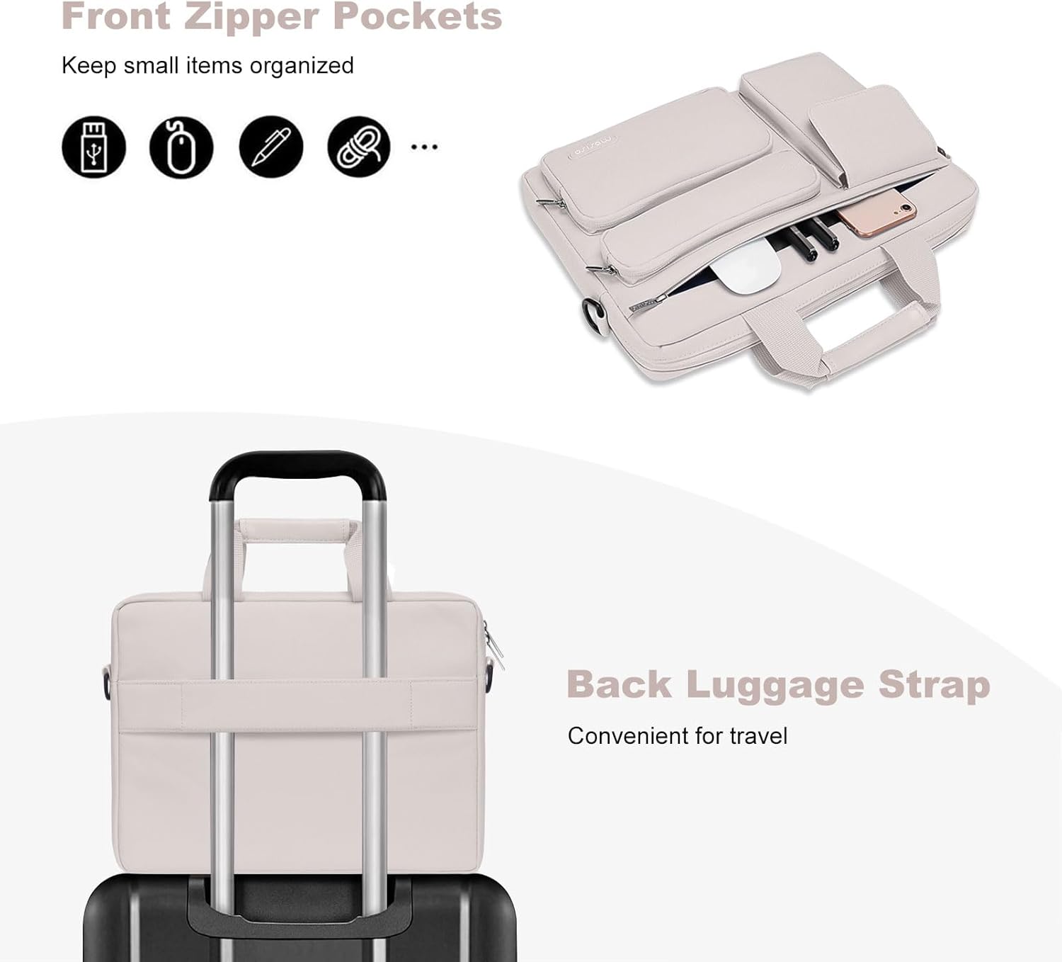 - The main inner compartment holds your laptop and other important things. 2 raised & 1 flapover & 1 horizontal pockets are convenient for quick-access and store cell phone, pen slots, wallet, keys and other small items. Multifuncional 4 front pockets design laptop shoulder bag enables you to carry your laptop/notebook/ultrabook computer in a uniquely sleek style.