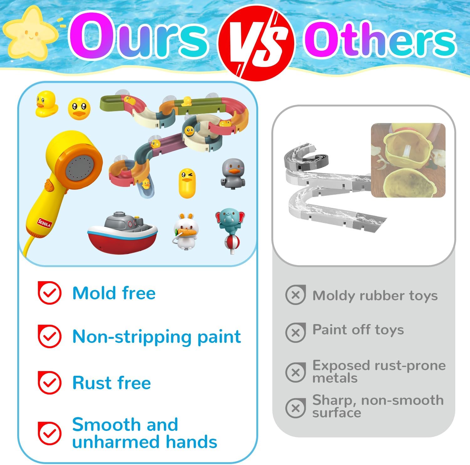 - [Safe & Durable Baby Bath Toy] Upgraded slides are made of pliable, non-toxic rubber track instead of cheap plastic, more comfortable, safe and durable for baby to grip or build. 3 cute animal water spray toys are made of high quality ABS plastic, non-toxic and safe for babies. Durable bearings are made of nylon material. Smooth surface, no burrs and edges, protect baby's delicate hands