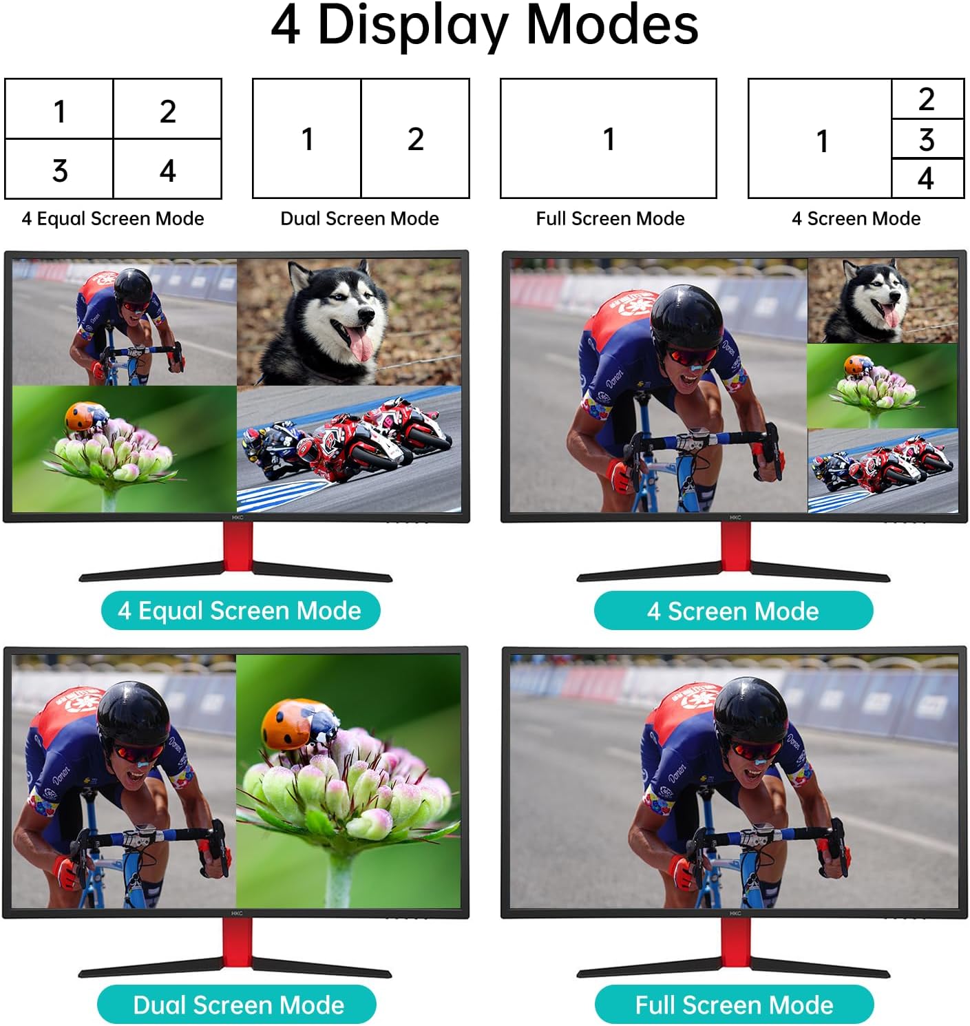 4 Display Modes: Single Mode / Quad Mode / PBP Mode / Dual Mode. 【Audio output】 only work for single mode and PBP(1 big/3 small screen) Mode.Other modes Mute