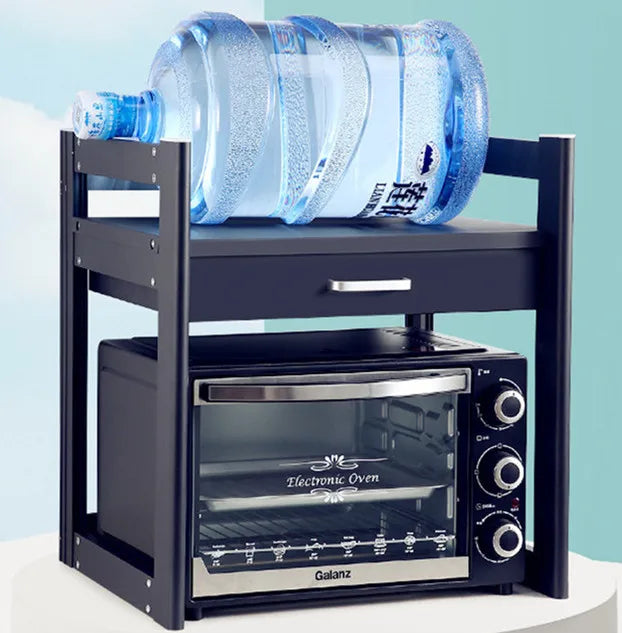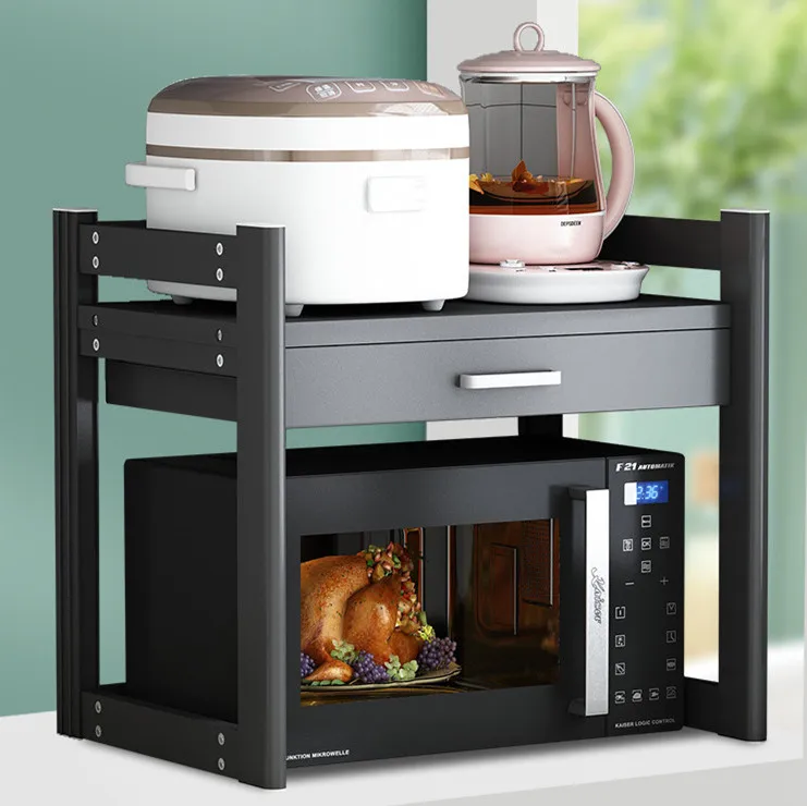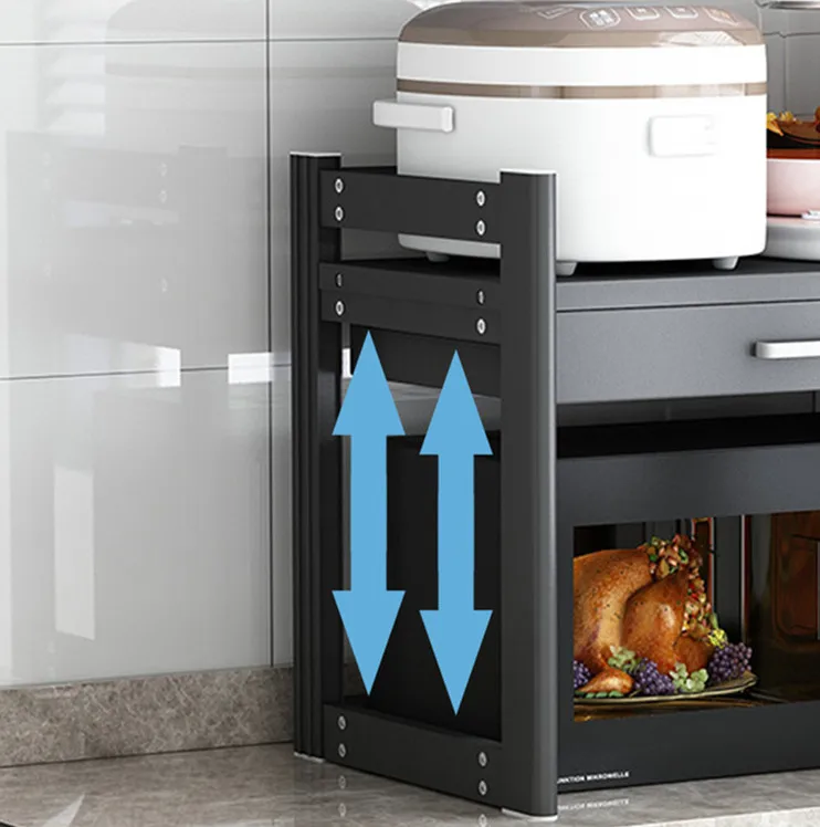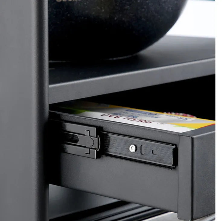 Featuring two open storage tiers and a built-in sliding drawer, it provides ample space for microwaves, printers, coffee machines, and kitchen essentials. The standing, non-folding design allows for easy setup without drilling, making it a practical and versatile storage solution for everyday use.
