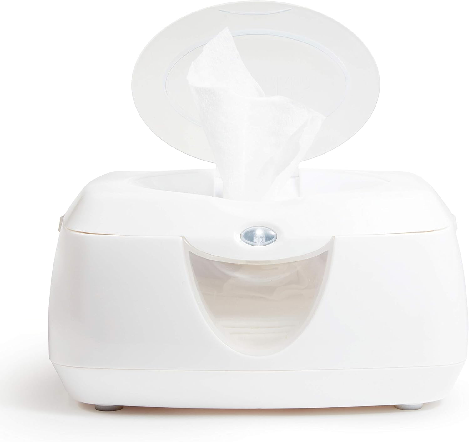 Make sure your baby has a warm, moist wipe every time with our top-warming system. The flip-top lid activates a soothing 10-minute light so you can easily change your baby at night without waking them up. It holds up to 100 pop-up wipes and has a window so you can check the level at a glance. So no more startling cold wipes or nighttime lights to wake up a drowsy baby. Because a sleeping baby means a sleeping mom. Top down warmer prevents browning. On/off button controls light. Limited 1-year warranty. The item is white in color with bluish-purple accents.