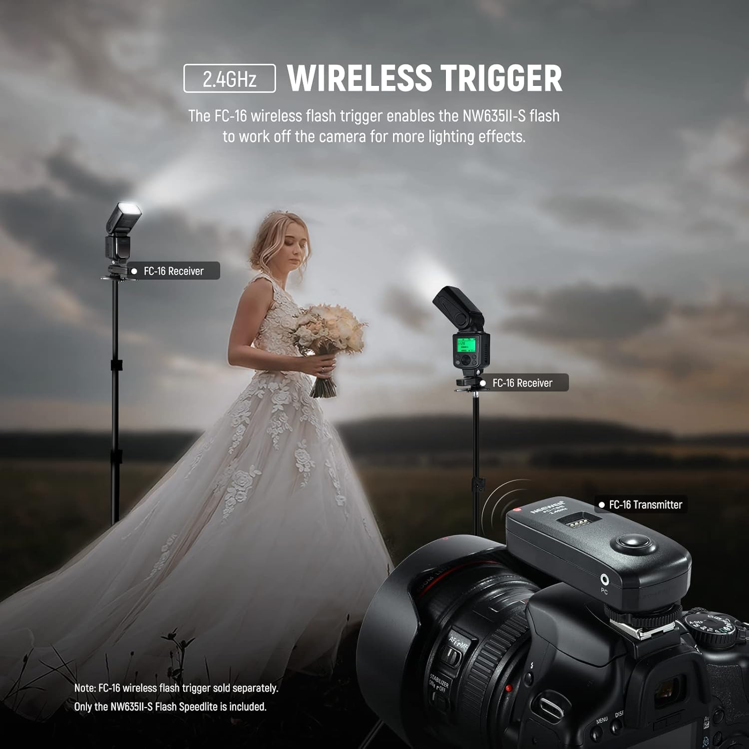 - 【Lightweight & Powerful Output】 Weighing only 14.1oz (400g), NW635II-S is a potent external on camera flash that is easy to carry. The GN58 guide number (ISO 100, 180mm) ensures powerful flash outputs and a consistent 5600K±200K color temperature—suitable for photographers longing for uniform color in their shots