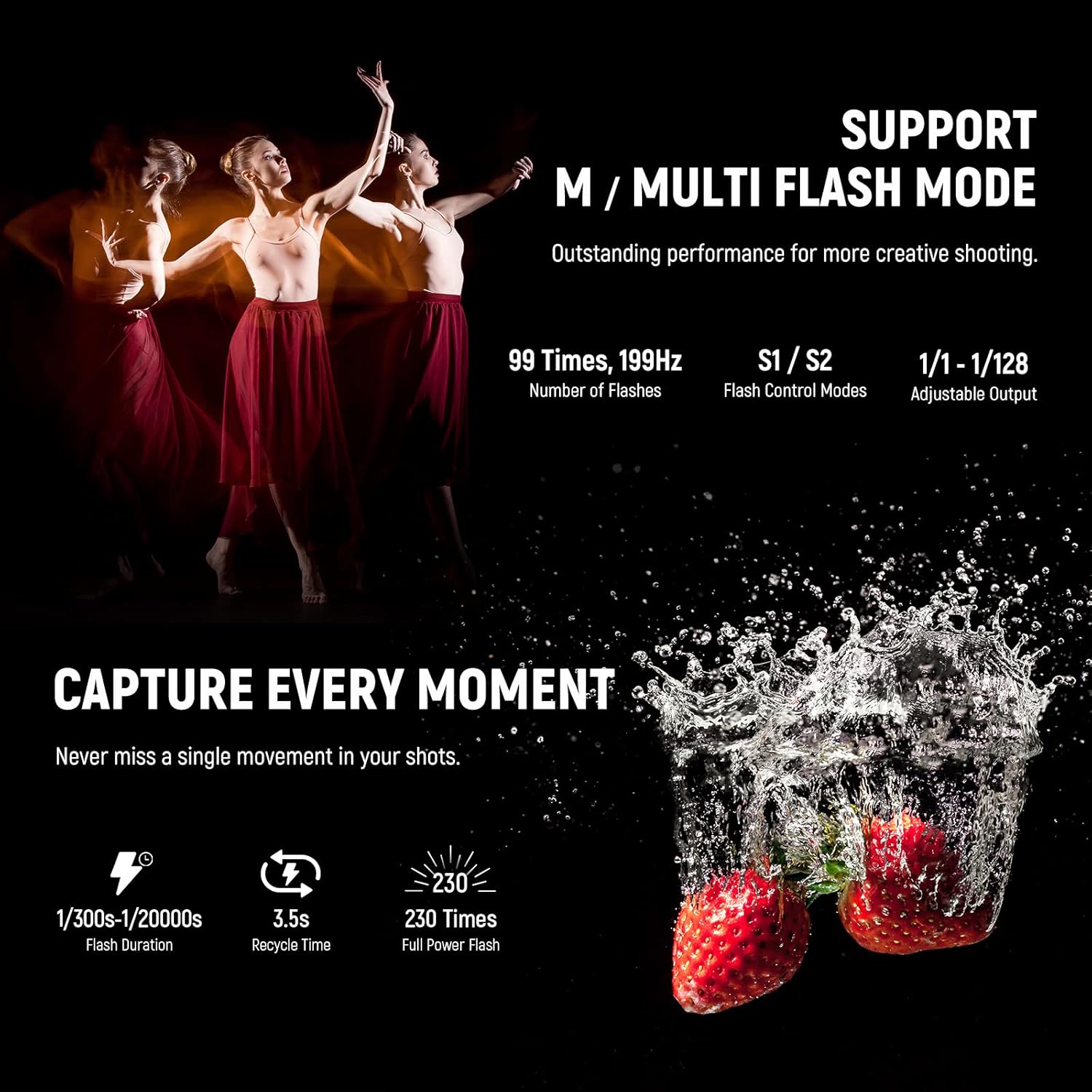 - 【Manual & Stroboscopic Modes】 In the M (Manual) Mode, the output can be adjusted from 1/1 to 1/128 with an increment of 1/3 for precise flash control. The S1/S2 Mode enables the flash to be triggered by other light sources, and the Multi Mode helps you create stroboscopic effects by capturing a sequence of movement