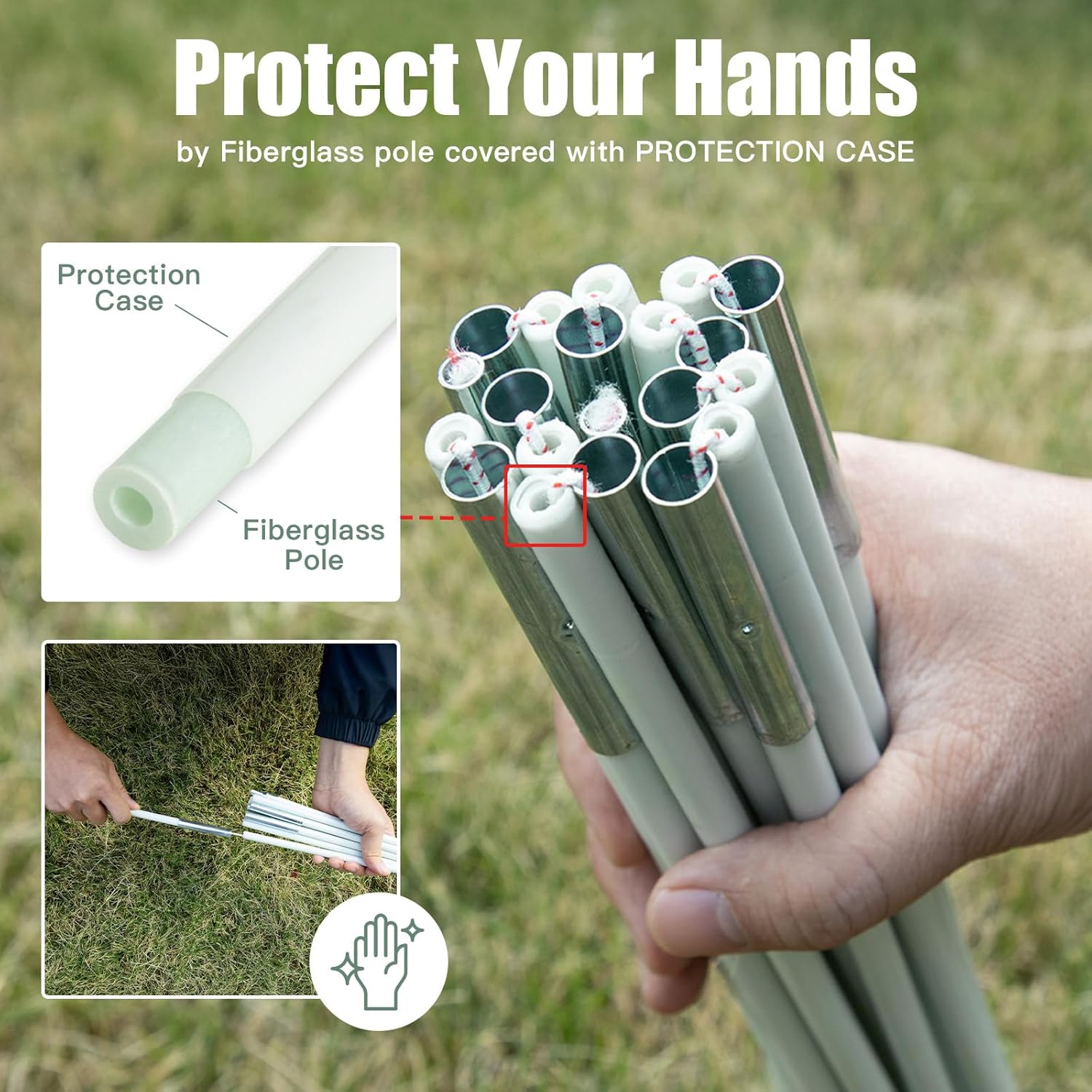 【Waterproof & Windproof】 210T PET fabric PU 3000, 210D oxford bottom fabric PU 2000, waterproof tape on every seam, to ensure the inside dome tent is completely dry under any rain situation even in the storm. Strong fiber glass poles guarantee the stability and long service life of using. Pegs and guy lines make it stable in a windy day